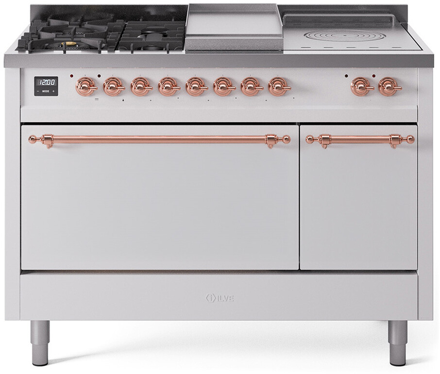 Freestanding Dual Fuel Range with 5 Sealed Burners, 5.02 cu. ft. Total Capacity, Storage Drawer, Griddle, and French Top: White, Copper Trim, Solid Door. Enjoy versatile cooking options with five sealed burners that provide precise control and even heat distribution for all your culinary needs. Cook multiple dishes at once with the spacious 5.02 cubic feet oven capacity, perfect for large family meals and entertaining guests. Keep your kitchen organized with the convenient storage drawer, providing easy access to pots, pans, and cooking utensils. Expand your cooking possibilities with the included griddle, ideal for preparing pancakes, eggs, and grilled sandwiches. Experience gourmet cooking with the French top, offering a versatile surface for simmering, searing, and sauting. With power up to 25000 btu as standard. Optimal supply and perfect distribution of the heat, for all types of cooking. With non-stick nanotechnological treatment. The noble technical characteristics of brass are enriched with a nanotechnological coating that assures easy cleaning, with an elegant Total Black finish. Structure in AISI 304 steel with 12/10 thickness, option to choose the ideal combination between a gas hob with up to 9 burners or induction, mixed and in various setups. The indestructible cast iron pan supports provide a functional and safe support for the pots. The electronic control ensures that the temperature of the oven remains constant throughout, without fluctuating, as is the case in conventional ovens. It can be set with precision starting from 85F, for perfect proofing, up to 575F, for roasting. The door hinges are fitted with a shock absorber that makes the closure more gradual and noiseless. The quick oven preheating function allows it to reach the desired temperature in a short time and you can then choose the best-suited cooking mode for the dish. It also works as rapid defrosting when a low temperature is set (85F 105F). The grease does not stick to the surface and can therefore be cleaned more easily. Pizza function. Quick start. Multiple fan cooking. Intensive cooking. Fan grill cooking. Grill cooking with closed-door. Cooking from above. Cooking from below. Static normal cooking. Grill cooking with closed-door. Cooking from above. Cooking from below. Static normal cooking. Series: Nostalgie II. Noblesse Frames: No. Fuel Type: Dual Fuel. Gas Type: Natural Gas. Installation Type: Freestanding. Oven Total Capacity (cu. ft.): 5.02. Sabbath Mode: No. Number of Racks: 2. Drawer Type: Storage Drawer. Display Type: LCD Display. Timer: Yes. Cooking Probe: Yes. Rotisserie: Yes. Soft Close Door: Yes. Cooktop Configuration: 5 Sealed Burners + Griddle + French Top. Burner/Element Type: Sealed Burner. Griddle: Yes. Grill: No. Oven Control Type: Knobs. Oven Door Type: Solid Door. Number of Ovens: Double Oven. Main Oven Capacity (cu. ft.): 3.5. Second Oven Capacity (cu. ft.): 1.52. Oven Cleaning Type: Easy Clean Enamel Cavities. Main Oven Type: UOV 80 M. Second Oven Type: UOV 30 E. ADA Compliant: No. Star-K Certified: No. Voltage: 240 V. Amps: 25.8 A. Exterior Width: 48". Width: 47 7/8". Depth: 27". Height: 36 1/4" - 38 1/2".