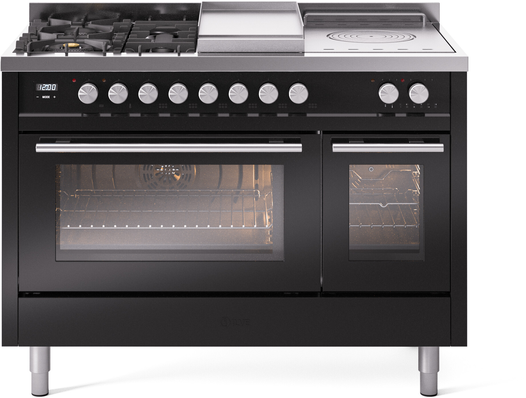 Freestanding Dual Fuel Range with 6 Sealed Burners, Fry Top Griddle, Coup de Feu, 5.02 Cu. Ft. Total Oven Capacity, Double Ovens, Soft-Closing Door & Drawer, 9 Cooking Modes: Glossy Black, NG. Professional Plus II, a combination of professional style and innovative functionality with irresistible appeal of technology and performance. Made with AISI304 steel - the raw material par excellence used in the kitchens of the best restaurants. Aesthetics is important, but that's not all. It is essential to have the best technologies available to cook well and with pleasure. ILVE puts all its experience and research at your service, offering solutions that combine top-level performance and maximum simplicity, safety and user-friendliness: to always guarantee the best satisfaction. Optimal supply and perfect distribution of the heat, for all types of cooking. The noble technical characteristics of brass are enriched with a nanotechnological coating that assures easy cleaning, with an elegant Total Black finish. The indestructible cast iron pan supports provide a functional and safe support for the pots. The door hinges are fitted with a shock absorber that makes closure more gradual and noiseless. Ensure the oven temperature remain constant throughout, without fluctuating, as is the case in conventional ovens. Set at 85F for perfect proofing, or up to 575F for roasting. The grease does not stick to the surface and can therefore be cleaned more easily. The taste of tradition, with a modern twist. Cooking with love means improving the quality of life, an important promise that ILVE always keeps. Its collections address people's needs in a tangible, consistent and elegant way. From the appeal of classic styles to new design trends, ILVE designs appliances that decorate, paying the utmost attention to technology and details. For over 50 years ILVE has been a world class leader in cooking systems. They first introduced their oversized built-in oven in 1969, and only a few years later unveiled their revolutionary Panoramagic range cooker. In their half century of continued research and commitment, ILVE has designed and implemented solutions that have raised the levels of performance, safety and satisfaction in the kitchen-because cooking well means living well. ILVE ranges are inspired by the kitchens in which the great chefs work their wonders, but their aesthetics and efficiency suit the home. ILVE uses the same durable materials as professional kitchens: stainless steel (Aisi 304), cast iron, brass and copper. Like the selection of the raw materials, the technological features of every range component also undergo strict inspection. ILVE appliances are made individually, according to customer specifications, and are assembled by hand with expertise, passion and craftsmanship. The reliability of ILVE products and services has been proven for for over 50 years. Every ILVE appliance and range cooker is produced in line with the highest quality certifications, and manually assembled by skilled craftsmen who oversee even the smallest detail. This guarantees perfect operation for decades, as evidenced by the satisfaction of our many customers who demand functionality, safety and durability. Style: Freestanding. Cooktop: Sealed Burners, Fry Top Griddle and Coupe de Feu. Drawer: Storage. Fuel Type: Dual Fuel. Digital Clock: Yes. Pro-Style: Yes. Exterior Width: 48". Width: 47 7/8". Height: 36 1/4". Depth: 25 1/2". Double Oven: Yes. Main Oven Capacity: 3.5 cu. ft. Secondary Oven Capacity: 1.52 cu. ft. Total Oven Capacity: 5.02 cu. ft. Steam-Clean: No. Broiler: Yes. Sabbath Mode: No. Self-Cleaning: No. Convection: Yes. Delay Bake: No. Digital Temperature Display: Yes. Oven Control Type: Digital. Steam Oven: No. Temperature Probe: Yes. Interior Oven Light: Yes. # of Burners: 6. Cooktop Control Type: Knobs. Downdraft Ventilation: No. Grill: No. Cast Iron Grates: Yes. French Top Griddle: Yes. Highest Burner Output: 25000 BTU. Total BTUs for all burners: 14900 BTU/h - 69000 BTU/h. Burner 1: Double Ring Dual Burner: 900 BTU/h - 25000 BTU/h. Burner 2: Big Burner: 2000 BTU/h - 10500 BTU/h. Burner 3: Oval burner: 10500 btu/h / 3100 btu/h. Burner 4: Griddle Small Burner: 1400 BTU/h - 7000 BTU/h. Burner 5: Griddle Large Burner: 2000 BTU/h - 10500 BTU/h. Burner 6: Coupe de Feu: 5500 btu/h. Volts: 240 Volts. Amps: 25.8 Amps. ADA Compliant: No. Handle Shape: Rectangular. Handle Type: Bar. Cool Door with Triple Oven Glass: Yes. Storage Drawer: Yes. Handcrafted from Italy: Yes. High-End Workmanship: Yes. Rotisserie: Yes. Soft Close Door System: Yes. ETL: Yes.