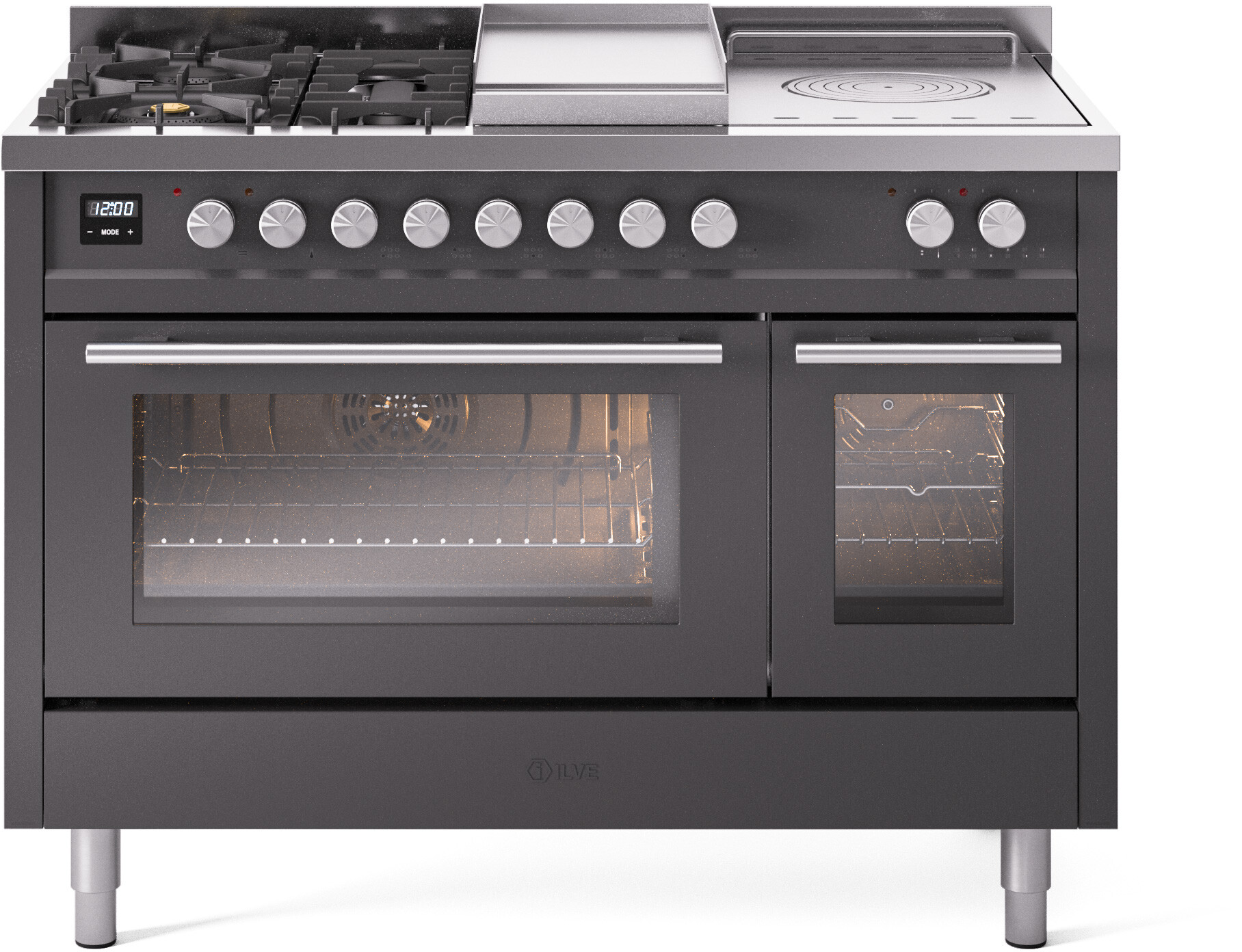 Freestanding Dual Fuel Range with 6 Sealed Burners, Fry Top Griddle, Coup de Feu, 5.02 Cu. Ft. Total Oven Capacity, Double Ovens, Soft-Closing Door & Drawer, 9 Cooking Modes: Graphite Matte, NG. Professional Plus II, a combination of professional style and innovative functionality with irresistible appeal of technology and performance. Made with AISI304 steel - the raw material par excellence used in the kitchens of the best restaurants. Aesthetics is important, but that's not all. It is essential to have the best technologies available to cook well and with pleasure. ILVE puts all its experience and research at your service, offering solutions that combine top-level performance and maximum simplicity, safety and user-friendliness: to always guarantee the best satisfaction. Optimal supply and perfect distribution of the heat, for all types of cooking. The noble technical characteristics of brass are enriched with a nanotechnological coating that assures easy cleaning, with an elegant Total Black finish. The indestructible cast iron pan supports provide a functional and safe support for the pots. The door hinges are fitted with a shock absorber that makes closure more gradual and noiseless. Ensure the oven temperature remain constant throughout, without fluctuating, as is the case in conventional ovens. Set at 85F for perfect proofing, or up to 575F for roasting. The grease does not stick to the surface and can therefore be cleaned more easily. The taste of tradition, with a modern twist. Cooking with love means improving the quality of life, an important promise that ILVE always keeps. Its collections address people's needs in a tangible, consistent and elegant way. From the appeal of classic styles to new design trends, ILVE designs appliances that decorate, paying the utmost attention to technology and details. For over 50 years ILVE has been a world class leader in cooking systems. They first introduced their oversized built-in oven in 1969, and only a few years later unveiled their revolutionary Panoramagic range cooker. In their half century of continued research and commitment, ILVE has designed and implemented solutions that have raised the levels of performance, safety and satisfaction in the kitchen-because cooking well means living well. ILVE ranges are inspired by the kitchens in which the great chefs work their wonders, but their aesthetics and efficiency suit the home. ILVE uses the same durable materials as professional kitchens: stainless steel (Aisi 304), cast iron, brass and copper. Like the selection of the raw materials, the technological features of every range component also undergo strict inspection. ILVE appliances are made individually, according to customer specifications, and are assembled by hand with expertise, passion and craftsmanship. The reliability of ILVE products and services has been proven for for over 50 years. Every ILVE appliance and range cooker is produced in line with the highest quality certifications, and manually assembled by skilled craftsmen who oversee even the smallest detail. This guarantees perfect operation for decades, as evidenced by the satisfaction of our many customers who demand functionality, safety and durability. Style: Freestanding. Cooktop: Sealed Burners, Fry Top Griddle and Coupe de Feu. Drawer: Storage. Fuel Type: Dual Fuel. Digital Clock: Yes. Pro-Style: Yes. Exterior Width: 48". Width: 47 7/8". Height: 36 1/4". Depth: 25 1/2". Double Oven: Yes. Main Oven Capacity: 3.5 cu. ft. Secondary Oven Capacity: 1.52 cu. ft. Total Oven Capacity: 5.02 cu. ft. Steam-Clean: No. Broiler: Yes. Sabbath Mode: No. Self-Cleaning: No. Convection: Yes. Delay Bake: No. Digital Temperature Display: Yes. Oven Control Type: Digital. Steam Oven: No. Temperature Probe: Yes. Interior Oven Light: Yes. # of Burners: 6. Cooktop Control Type: Knobs. Downdraft Ventilation: No. Grill: No. Cast Iron Grates: Yes. French Top Griddle: Yes. Highest Burner Output: 25000 BTU. Total BTUs for all burners: 14900 BTU/h - 69000 BTU/h. Burner 1: Double Ring Dual Burner: 900 BTU/h - 25000 BTU/h. Burner 2: Big Burner: 2000 BTU/h - 10500 BTU/h. Burner 3: Oval burner: 10500 btu/h / 3100 btu/h. Burner 4: Griddle Small Burner: 1400 BTU/h - 7000 BTU/h. Burner 5: Griddle Large Burner: 2000 BTU/h - 10500 BTU/h. Burner 6: Coupe de Feu: 5500 btu/h. Volts: 240 Volts. Amps: 25.8 Amps. ADA Compliant: No. Handle Shape: Rectangular. Handle Type: Bar. Cool Door with Triple Oven Glass: Yes. Storage Drawer: Yes. Handcrafted from Italy: Yes. High-End Workmanship: Yes. Rotisserie: Yes. Soft Close Door System: Yes. ETL: Yes.