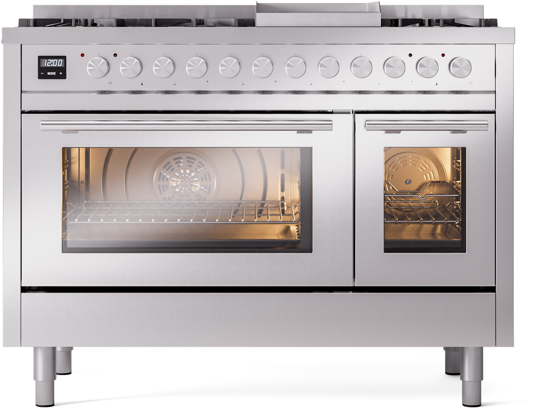 Freestanding Dual Fuel Range with 8 Sealed Burners, Fry Top Griddle, 5.02 Cu. Ft. Total Oven Capacity, Double Ovens, Soft-Closing Door & Drawer and 9 Cooking Modes: Stainless Steel, NG. Professional Plus II, a combination of professional style and innovative functionality with irresistible appeal of technology and performance. Made with AISI304 steel - the raw material par excellence used in the kitchens of the best restaurants. Aesthetics is important, but that's not all. It is essential to have the best technologies available to cook well and with pleasure. ILVE puts all its experience and research at your service, offering solutions that combine top-level performance and maximum simplicity, safety and user-friendliness: to always guarantee the best satisfaction. Optimal supply and perfect distribution of the heat, for all types of cooking. The noble technical characteristics of brass are enriched with a nanotechnological coating that assures easy cleaning, with an elegant Total Black finish. The indestructible cast iron pan supports provide a functional and safe support for the pots. The door hinges are fitted with a shock absorber that makes closure more gradual and noiseless. Ensure the oven temperature remain constant throughout, without fluctuating, as is the case in conventional ovens. Set at 85F for perfect proofing, or up to 575F for roasting. The grease does not stick to the surface and can therefore be cleaned more easily. The taste of tradition, with a modern twist. Cooking with love means improving the quality of life, an important promise that ILVE always keeps. Its collections address people's needs in a tangible, consistent and elegant way. From the appeal of classic styles to new design trends, ILVE designs appliances that decorate, paying the utmost attention to technology and details. For over 50 years ILVE has been a world class leader in cooking systems. They first introduced their oversized built-in oven in 1969, and only a few years later unveiled their revolutionary Panoramagic range cooker. In their half century of continued research and commitment, ILVE has designed and implemented solutions that have raised the levels of performance, safety and satisfaction in the kitchen-because cooking well means living well. ILVE ranges are inspired by the kitchens in which the great chefs work their wonders, but their aesthetics and efficiency suit the home. ILVE uses the same durable materials as professional kitchens: stainless steel (Aisi 304), cast iron, brass and copper. Like the selection of the raw materials, the technological features of every range component also undergo strict inspection. ILVE appliances are made individually, according to customer specifications, and are assembled by hand with expertise, passion and craftsmanship. The reliability of ILVE products and services has been proven for for over 50 years. Every ILVE appliance and range cooker is produced in line with the highest quality certifications, and manually assembled by skilled craftsmen who oversee even the smallest detail. This guarantees perfect operation for decades, as evidenced by the satisfaction of our many customers who demand functionality, safety and durability. Style: Freestanding. Cooktop: Sealed Burners, Fry Top Griddle. Drawer: Storage. Fuel Type: Dual Fuel. Digital Clock: Yes. Pro-Style: Yes. Exterior Width: 48". Width: 47 7/8". Height: 36 1/4". Depth: 25 1/2". Double Oven: Yes. Main Oven Capacity: 3.5 cu. ft. Secondary Oven Capacity: 1.52 cu. ft. Total Oven Capacity: 5.02 cu. ft. Steam-Clean: No. Broiler: Yes. Sabbath Mode: No. Self-Cleaning: No. Convection: Yes. Delay Bake: No. Digital Temperature Display: Yes. Oven Control Type: Digital. Steam Oven: No. Temperature Probe: Yes. Interior Oven Light: Yes. # of Burners: 8. Cooktop Control Type: Knobs. Downdraft Ventilation: No. Grill: No. Cast Iron Grates: Yes. French Top Griddle: Yes. Highest Burner Output: 25000 BTU. Total BTUs for all burners: 14900 BTU/h - 69000 BTU/h. Burner 1: Double Ring Dual Burner: 900 BTU/h - 25000 BTU/h. Burner 2: Big Burner: 2000 BTU/h - 10500 BTU/h. Burner 3: Small Burner: 1400 BTU/h - 7000 BTU/h. Burner 4: Big Burner: 2000 BTU/h - 10500 BTU/h. Burner 5: Griddle Small Burner: 1400 BTU/h - 7000 BTU/h. Burner 6: Griddle Large Burner: 2000 BTU/h - 10500 BTU/h. Burner 7: Double Ring Dual Burner: 900 BTU/h - 25000 BTU/h. Burner 8: Big Burner: 2000 BTU/h - 10500 BTU/h. Volts: 240 Volts. Amps: 25.8 Amps. ADA Compliant: No. Handle Shape: Rectangular. Handle Type: Bar. Cool Door with Triple Oven Glass: Yes. Storage Drawer: Yes. Handcrafted from Italy: Yes. High-End Workmanship: Yes. Rotisserie: Yes. Soft Close Door System: Yes. ETL: Yes.