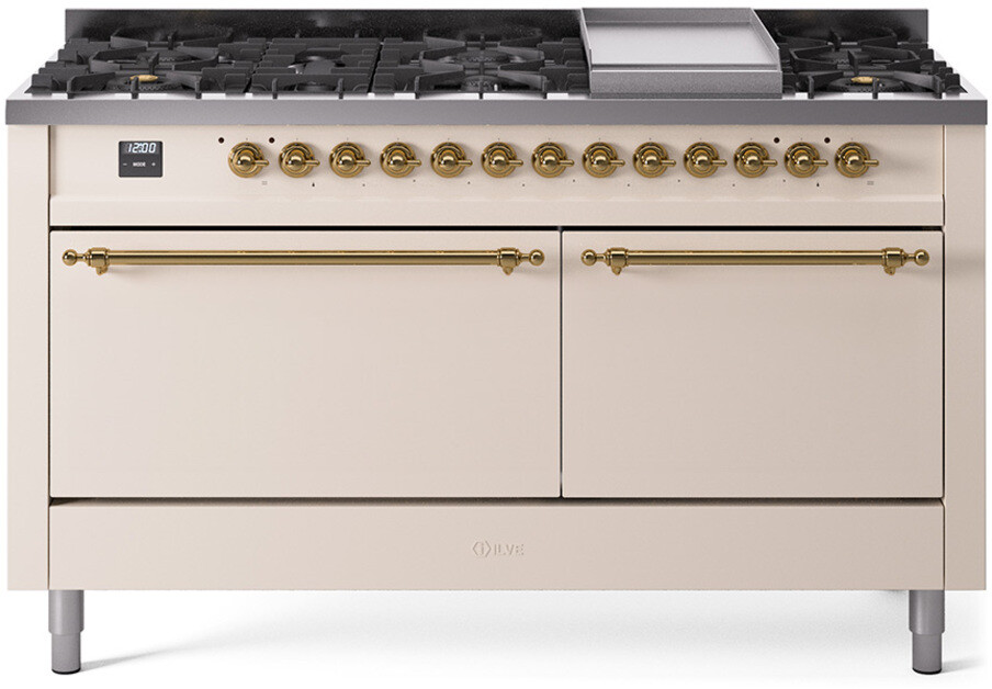 Freestanding Dual Fuel Range with 9 Sealed Burners, 5.8 cu. ft. Total Capacity, Storage Drawer, and Griddle: Antique White, Brass Trim, Solid Door. Experience versatile cooking with nine sealed burners, providing a range of heat outputs for all your culinary needs. Enjoy ample space with a 5.8 cubic feet total oven capacity, perfect for preparing large meals and multiple dishes simultaneously. Conveniently store your cooking essentials within easy reach in the integrated storage drawer. Expand your cooking options with a built-in griddle, ideal for making pancakes, eggs, and grilled sandwiches. With power up to 25000 btu as standard. Optimal supply and perfect distribution of the heat, for all types of cooking. With non-stick nanotechnological treatment. The noble technical characteristics of brass are enriched with a nanotechnological coating that assures easy cleaning, with an elegant Total Black finish. Structure in AISI 304 steel with 12/10 thickness, option to choose the ideal combination between a gas hob with up to 9 burners or induction, mixed and in various setups. The indestructible cast iron pan supports provide a functional and safe support for the pots. The electronic control ensures that the temperature of the oven remains constant throughout, without fluctuating, as is the case in conventional ovens. It can be set with precision starting from 85F, for perfect proofing, up to 575F, for roasting. The door hinges are fitted with a shock absorber that makes the closure more gradual and noiseless. The quick oven preheating function allows it to reach the desired temperature in a short time and you can then choose the best-suited cooking mode for the dish. It also works as rapid defrosting when a low temperature is set (85F 105F). The grease does not stick to the surface and can therefore be cleaned more easily. Pizza function. Quick start. Multiple fan cooking. Intensive cooking. Fan grill cooking. Grill cooking with closed-door. Cooking from above. Cooking from below. Static normal cooking. Pizza function. Quick start. Multiple fan cooking. Intensive cooking. Fan grill cooking. Grill cooking with closed-door. Cooking from above. Cooking from below. Static normal cooking. Series: Nostalgie II. Noblesse Frames: No. Fuel Type: Dual Fuel. Gas Type: Natural Gas. Installation Type: Freestanding. Oven Total Capacity (cu. ft.): 5.8. Sabbath Mode: No. Number of Racks: 2. Drawer Type: Storage Drawer. Display Type: LCD Display. Timer: Yes. Cooking Probe: Yes. Rotisserie: Yes. Soft Close Door: Yes. Cooktop Configuration: 9 Sealed Burners + Griddle. Burner/Element Type: Sealed Burner. Griddle: Yes. Grill: No. Oven Control Type: Knobs. Oven Door Type: Solid Door. Number of Ovens: Double Oven. Main Oven Capacity (cu. ft.): 3.5. Second Oven Capacity (cu. ft.): 2.3. Oven Cleaning Type: Easy Clean Enamel Cavities. Main Oven Type: UOV 80 M. Second Oven Type: UOV 60 M. ADA Compliant: No. Star-K Certified: No. Voltage: 240 V. Amps: 30 A. Exterior Width: 60". Width: 59 1/2". Depth: 27". Height: 36 1/4" - 38 1/2".
