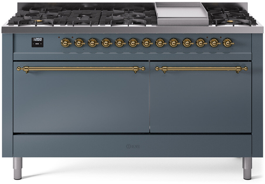 Freestanding Dual Fuel Range with 9 Sealed Burners, 5.8 cu. ft. Total Capacity, Storage Drawer, and Griddle: Blue Grey, Brass Trim, Solid Door. Experience versatile cooking with nine sealed burners, providing a range of heat outputs for all your culinary needs. Enjoy ample space with a 5.8 cubic feet total oven capacity, perfect for preparing large meals and multiple dishes simultaneously. Conveniently store your cooking essentials within easy reach in the integrated storage drawer. Expand your cooking options with a built-in griddle, ideal for making pancakes, eggs, and grilled sandwiches. With power up to 25000 btu as standard. Optimal supply and perfect distribution of the heat, for all types of cooking. With non-stick nanotechnological treatment. The noble technical characteristics of brass are enriched with a nanotechnological coating that assures easy cleaning, with an elegant Total Black finish. Structure in AISI 304 steel with 12/10 thickness, option to choose the ideal combination between a gas hob with up to 9 burners or induction, mixed and in various setups. The indestructible cast iron pan supports provide a functional and safe support for the pots. The electronic control ensures that the temperature of the oven remains constant throughout, without fluctuating, as is the case in conventional ovens. It can be set with precision starting from 85F, for perfect proofing, up to 575F, for roasting. The door hinges are fitted with a shock absorber that makes the closure more gradual and noiseless. The quick oven preheating function allows it to reach the desired temperature in a short time and you can then choose the best-suited cooking mode for the dish. It also works as rapid defrosting when a low temperature is set (85F 105F). The grease does not stick to the surface and can therefore be cleaned more easily. Pizza function. Quick start. Multiple fan cooking. Intensive cooking. Fan grill cooking. Grill cooking with closed-door. Cooking from above. Cooking from below. Static normal cooking. Pizza function. Quick start. Multiple fan cooking. Intensive cooking. Fan grill cooking. Grill cooking with closed-door. Cooking from above. Cooking from below. Static normal cooking. Series: Nostalgie II. Noblesse Frames: No. Fuel Type: Dual Fuel. Gas Type: Natural Gas. Installation Type: Freestanding. Oven Total Capacity (cu. ft.): 5.8. Sabbath Mode: No. Number of Racks: 2. Drawer Type: Storage Drawer. Display Type: LCD Display. Timer: Yes. Cooking Probe: Yes. Rotisserie: Yes. Soft Close Door: Yes. Cooktop Configuration: 9 Sealed Burners + Griddle. Burner/Element Type: Sealed Burner. Griddle: Yes. Grill: No. Oven Control Type: Knobs. Oven Door Type: Solid Door. Number of Ovens: Double Oven. Main Oven Capacity (cu. ft.): 3.5. Second Oven Capacity (cu. ft.): 2.3. Oven Cleaning Type: Easy Clean Enamel Cavities. Main Oven Type: UOV 80 M. Second Oven Type: UOV 60 M. ADA Compliant: No. Star-K Certified: No. Voltage: 240 V. Amps: 30 A. Exterior Width: 60". Width: 59 1/2". Depth: 27". Height: 36 1/4" - 38 1/2".