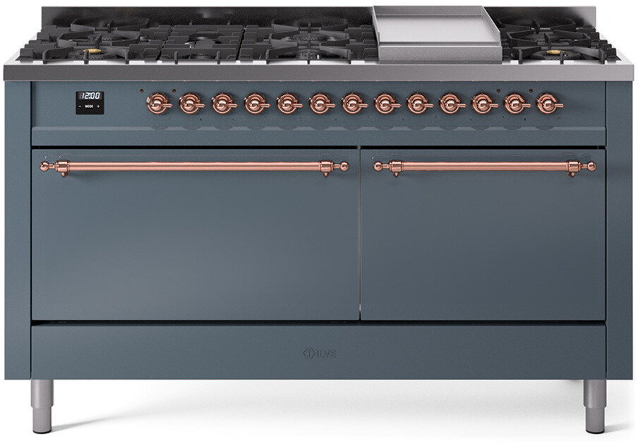 Freestanding Dual Fuel Range with 9 Sealed Burners, 5.8 cu. ft. Total Capacity, Storage Drawer, and Griddle: Blue Grey, Copper Trim, Solid Door. Experience versatile cooking with nine sealed burners, providing a range of heat outputs for all your culinary needs. Enjoy ample space with a 5.8 cubic feet total oven capacity, perfect for preparing large meals and multiple dishes simultaneously. Conveniently store your cooking essentials within easy reach in the integrated storage drawer. Expand your cooking options with a built-in griddle, ideal for making pancakes, eggs, and grilled sandwiches. With power up to 25000 btu as standard. Optimal supply and perfect distribution of the heat, for all types of cooking. With non-stick nanotechnological treatment. The noble technical characteristics of brass are enriched with a nanotechnological coating that assures easy cleaning, with an elegant Total Black finish. Structure in AISI 304 steel with 12/10 thickness, option to choose the ideal combination between a gas hob with up to 9 burners or induction, mixed and in various setups. The indestructible cast iron pan supports provide a functional and safe support for the pots. The electronic control ensures that the temperature of the oven remains constant throughout, without fluctuating, as is the case in conventional ovens. It can be set with precision starting from 85F, for perfect proofing, up to 575F, for roasting. The door hinges are fitted with a shock absorber that makes the closure more gradual and noiseless. The quick oven preheating function allows it to reach the desired temperature in a short time and you can then choose the best-suited cooking mode for the dish. It also works as rapid defrosting when a low temperature is set (85F 105F). The grease does not stick to the surface and can therefore be cleaned more easily. Pizza function. Quick start. Multiple fan cooking. Intensive cooking. Fan grill cooking. Grill cooking with closed-door. Cooking from above. Cooking from below. Static normal cooking. Pizza function. Quick start. Multiple fan cooking. Intensive cooking. Fan grill cooking. Grill cooking with closed-door. Cooking from above. Cooking from below. Static normal cooking. Series: Nostalgie II. Noblesse Frames: No. Fuel Type: Dual Fuel. Gas Type: Natural Gas. Installation Type: Freestanding. Oven Total Capacity (cu. ft.): 5.8. Sabbath Mode: No. Number of Racks: 2. Drawer Type: Storage Drawer. Display Type: LCD Display. Timer: Yes. Cooking Probe: Yes. Rotisserie: Yes. Soft Close Door: Yes. Cooktop Configuration: 9 Sealed Burners + Griddle. Burner/Element Type: Sealed Burner. Griddle: Yes. Grill: No. Oven Control Type: Knobs. Oven Door Type: Solid Door. Number of Ovens: Double Oven. Main Oven Capacity (cu. ft.): 3.5. Second Oven Capacity (cu. ft.): 2.3. Oven Cleaning Type: Easy Clean Enamel Cavities. Main Oven Type: UOV 80 M. Second Oven Type: UOV 60 M. ADA Compliant: No. Star-K Certified: No. Voltage: 240 V. Amps: 30 A. Exterior Width: 60". Width: 59 1/2". Depth: 27". Height: 36 1/4" - 38 1/2".
