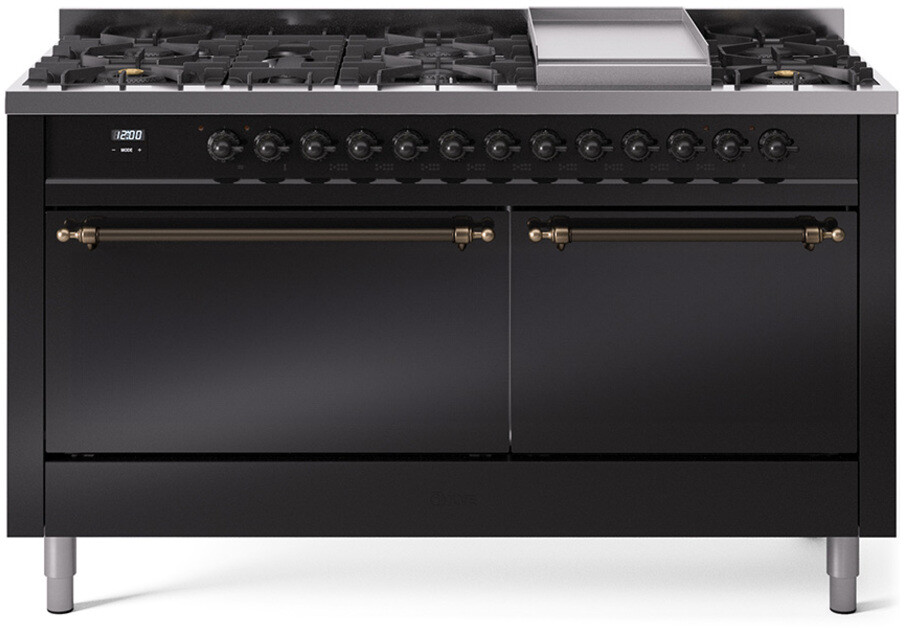 Freestanding Dual Fuel Range with 9 Sealed Burners, 5.8 cu. ft. Total Capacity, Storage Drawer, and Griddle: Glossy Black, Bronze Trim, Solid Door. Experience versatile cooking with nine sealed burners, providing a range of heat outputs for all your culinary needs. Enjoy ample space with a 5.8 cubic feet total oven capacity, perfect for preparing large meals and multiple dishes simultaneously. Conveniently store your cooking essentials within easy reach in the integrated storage drawer. Expand your cooking options with a built-in griddle, ideal for making pancakes, eggs, and grilled sandwiches. With power up to 25000 btu as standard. Optimal supply and perfect distribution of the heat, for all types of cooking. With non-stick nanotechnological treatment. The noble technical characteristics of brass are enriched with a nanotechnological coating that assures easy cleaning, with an elegant Total Black finish. Structure in AISI 304 steel with 12/10 thickness, option to choose the ideal combination between a gas hob with up to 9 burners or induction, mixed and in various setups. The indestructible cast iron pan supports provide a functional and safe support for the pots. The electronic control ensures that the temperature of the oven remains constant throughout, without fluctuating, as is the case in conventional ovens. It can be set with precision starting from 85F, for perfect proofing, up to 575F, for roasting. The door hinges are fitted with a shock absorber that makes the closure more gradual and noiseless. The quick oven preheating function allows it to reach the desired temperature in a short time and you can then choose the best-suited cooking mode for the dish. It also works as rapid defrosting when a low temperature is set (85F 105F). The grease does not stick to the surface and can therefore be cleaned more easily. Pizza function. Quick start. Multiple fan cooking. Intensive cooking. Fan grill cooking. Grill cooking with closed-door. Cooking from above. Cooking from below. Static normal cooking. Pizza function. Quick start. Multiple fan cooking. Intensive cooking. Fan grill cooking. Grill cooking with closed-door. Cooking from above. Cooking from below. Static normal cooking. Series: Nostalgie II. Noblesse Frames: No. Fuel Type: Dual Fuel. Gas Type: Natural Gas. Installation Type: Freestanding. Oven Total Capacity (cu. ft.): 5.8. Sabbath Mode: No. Number of Racks: 2. Drawer Type: Storage Drawer. Display Type: LCD Display. Timer: Yes. Cooking Probe: Yes. Rotisserie: Yes. Soft Close Door: Yes. Cooktop Configuration: 9 Sealed Burners + Griddle. Burner/Element Type: Sealed Burner. Griddle: Yes. Grill: No. Oven Control Type: Knobs. Oven Door Type: Solid Door. Number of Ovens: Double Oven. Main Oven Capacity (cu. ft.): 3.5. Second Oven Capacity (cu. ft.): 2.3. Oven Cleaning Type: Easy Clean Enamel Cavities. Main Oven Type: UOV 80 M. Second Oven Type: UOV 60 M. ADA Compliant: No. Star-K Certified: No. Voltage: 240 V. Amps: 30 A. Exterior Width: 60". Width: 59 1/2". Depth: 27". Height: 36 1/4" - 38 1/2".