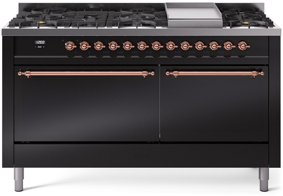 Freestanding Dual Fuel Range with 9 Sealed Burners, 5.8 cu. ft. Total Capacity, Storage Drawer, and Griddle: Glossy Black, Copper Trim, Solid Door. Experience versatile cooking with nine sealed burners, providing a range of heat outputs for all your culinary needs. Enjoy ample space with a 5.8 cubic feet total oven capacity, perfect for preparing large meals and multiple dishes simultaneously. Conveniently store your cooking essentials within easy reach in the integrated storage drawer. Expand your cooking options with a built-in griddle, ideal for making pancakes, eggs, and grilled sandwiches. With power up to 25000 btu as standard. Optimal supply and perfect distribution of the heat, for all types of cooking. With non-stick nanotechnological treatment. The noble technical characteristics of brass are enriched with a nanotechnological coating that assures easy cleaning, with an elegant Total Black finish. Structure in AISI 304 steel with 12/10 thickness, option to choose the ideal combination between a gas hob with up to 9 burners or induction, mixed and in various setups. The indestructible cast iron pan supports provide a functional and safe support for the pots. The electronic control ensures that the temperature of the oven remains constant throughout, without fluctuating, as is the case in conventional ovens. It can be set with precision starting from 85F, for perfect proofing, up to 575F, for roasting. The door hinges are fitted with a shock absorber that makes the closure more gradual and noiseless. The quick oven preheating function allows it to reach the desired temperature in a short time and you can then choose the best-suited cooking mode for the dish. It also works as rapid defrosting when a low temperature is set (85F 105F). The grease does not stick to the surface and can therefore be cleaned more easily. Pizza function. Quick start. Multiple fan cooking. Intensive cooking. Fan grill cooking. Grill cooking with closed-door. Cooking from above. Cooking from below. Static normal cooking. Pizza function. Quick start. Multiple fan cooking. Intensive cooking. Fan grill cooking. Grill cooking with closed-door. Cooking from above. Cooking from below. Static normal cooking. Series: Nostalgie II. Noblesse Frames: No. Fuel Type: Dual Fuel. Gas Type: Natural Gas. Installation Type: Freestanding. Oven Total Capacity (cu. ft.): 5.8. Sabbath Mode: No. Number of Racks: 2. Drawer Type: Storage Drawer. Display Type: LCD Display. Timer: Yes. Cooking Probe: Yes. Rotisserie: Yes. Soft Close Door: Yes. Cooktop Configuration: 9 Sealed Burners + Griddle. Burner/Element Type: Sealed Burner. Griddle: Yes. Grill: No. Oven Control Type: Knobs. Oven Door Type: Solid Door. Number of Ovens: Double Oven. Main Oven Capacity (cu. ft.): 3.5. Second Oven Capacity (cu. ft.): 2.3. Oven Cleaning Type: Easy Clean Enamel Cavities. Main Oven Type: UOV 80 M. Second Oven Type: UOV 60 M. ADA Compliant: No. Star-K Certified: No. Voltage: 240 V. Amps: 30 A. Exterior Width: 60". Width: 59 1/2". Depth: 27". Height: 36 1/4" - 38 1/2".