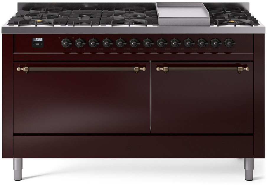 Freestanding Dual Fuel Range with 9 Sealed Burners, 5.8 cu. ft. Total Capacity, Storage Drawer, and Griddle: Burgundy, Bronze Trim, Solid Door. Experience versatile cooking with nine sealed burners, providing a range of heat outputs for all your culinary needs. Enjoy ample space with a 5.8 cubic feet total oven capacity, perfect for preparing large meals and multiple dishes simultaneously. Conveniently store your cooking essentials within easy reach in the integrated storage drawer. Expand your cooking options with a built-in griddle, ideal for making pancakes, eggs, and grilled sandwiches. With power up to 25000 btu as standard. Optimal supply and perfect distribution of the heat, for all types of cooking. With non-stick nanotechnological treatment. The noble technical characteristics of brass are enriched with a nanotechnological coating that assures easy cleaning, with an elegant Total Black finish. Structure in AISI 304 steel with 12/10 thickness, option to choose the ideal combination between a gas hob with up to 9 burners or induction, mixed and in various setups. The indestructible cast iron pan supports provide a functional and safe support for the pots. The electronic control ensures that the temperature of the oven remains constant throughout, without fluctuating, as is the case in conventional ovens. It can be set with precision starting from 85F, for perfect proofing, up to 575F, for roasting. The door hinges are fitted with a shock absorber that makes the closure more gradual and noiseless. The quick oven preheating function allows it to reach the desired temperature in a short time and you can then choose the best-suited cooking mode for the dish. It also works as rapid defrosting when a low temperature is set (85F 105F). The grease does not stick to the surface and can therefore be cleaned more easily. Pizza function. Quick start. Multiple fan cooking. Intensive cooking. Fan grill cooking. Grill cooking with closed-door. Cooking from above. Cooking from below. Static normal cooking. Pizza function. Quick start. Multiple fan cooking. Intensive cooking. Fan grill cooking. Grill cooking with closed-door. Cooking from above. Cooking from below. Static normal cooking. Series: Nostalgie II. Noblesse Frames: No. Fuel Type: Dual Fuel. Gas Type: Natural Gas. Installation Type: Freestanding. Oven Total Capacity (cu. ft.): 5.8. Sabbath Mode: No. Number of Racks: 2. Drawer Type: Storage Drawer. Display Type: LCD Display. Timer: Yes. Cooking Probe: Yes. Rotisserie: Yes. Soft Close Door: Yes. Cooktop Configuration: 9 Sealed Burners + Griddle. Burner/Element Type: Sealed Burner. Griddle: Yes. Grill: No. Oven Control Type: Knobs. Oven Door Type: Solid Door. Number of Ovens: Double Oven. Main Oven Capacity (cu. ft.): 3.5. Second Oven Capacity (cu. ft.): 2.3. Oven Cleaning Type: Easy Clean Enamel Cavities. Main Oven Type: UOV 80 M. Second Oven Type: UOV 60 M. ADA Compliant: No. Star-K Certified: No. Voltage: 240 V. Amps: 30 A. Exterior Width: 60". Width: 59 1/2". Depth: 27". Height: 36 1/4" - 38 1/2".