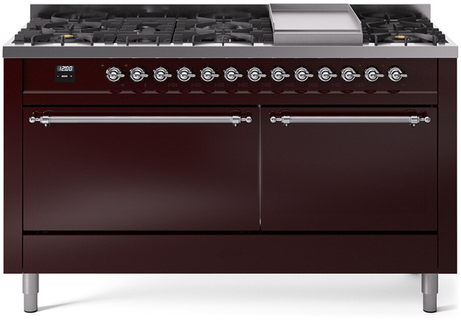 Freestanding Dual Fuel Range with 9 Sealed Burners, 5.8 cu. ft. Total Capacity, Storage Drawer, and Griddle: Burgundy, Chrome Trim, Solid Door. Experience versatile cooking with nine sealed burners, providing a range of heat outputs for all your culinary needs. Enjoy ample space with a 5.8 cubic feet total oven capacity, perfect for preparing large meals and multiple dishes simultaneously. Conveniently store your cooking essentials within easy reach in the integrated storage drawer. Expand your cooking options with a built-in griddle, ideal for making pancakes, eggs, and grilled sandwiches. With power up to 25000 btu as standard. Optimal supply and perfect distribution of the heat, for all types of cooking. With non-stick nanotechnological treatment. The noble technical characteristics of brass are enriched with a nanotechnological coating that assures easy cleaning, with an elegant Total Black finish. Structure in AISI 304 steel with 12/10 thickness, option to choose the ideal combination between a gas hob with up to 9 burners or induction, mixed and in various setups. The indestructible cast iron pan supports provide a functional and safe support for the pots. The electronic control ensures that the temperature of the oven remains constant throughout, without fluctuating, as is the case in conventional ovens. It can be set with precision starting from 85F, for perfect proofing, up to 575F, for roasting. The door hinges are fitted with a shock absorber that makes the closure more gradual and noiseless. The quick oven preheating function allows it to reach the desired temperature in a short time and you can then choose the best-suited cooking mode for the dish. It also works as rapid defrosting when a low temperature is set (85F 105F). The grease does not stick to the surface and can therefore be cleaned more easily. Pizza function. Quick start. Multiple fan cooking. Intensive cooking. Fan grill cooking. Grill cooking with closed-door. Cooking from above. Cooking from below. Static normal cooking. Pizza function. Quick start. Multiple fan cooking. Intensive cooking. Fan grill cooking. Grill cooking with closed-door. Cooking from above. Cooking from below. Static normal cooking. Series: Nostalgie II. Noblesse Frames: No. Fuel Type: Dual Fuel. Gas Type: Natural Gas. Installation Type: Freestanding. Oven Total Capacity (cu. ft.): 5.8. Sabbath Mode: No. Number of Racks: 2. Drawer Type: Storage Drawer. Display Type: LCD Display. Timer: Yes. Cooking Probe: Yes. Rotisserie: Yes. Soft Close Door: Yes. Cooktop Configuration: 9 Sealed Burners + Griddle. Burner/Element Type: Sealed Burner. Griddle: Yes. Grill: No. Oven Control Type: Knobs. Oven Door Type: Solid Door. Number of Ovens: Double Oven. Main Oven Capacity (cu. ft.): 3.5. Second Oven Capacity (cu. ft.): 2.3. Oven Cleaning Type: Easy Clean Enamel Cavities. Main Oven Type: UOV 80 M. Second Oven Type: UOV 60 M. ADA Compliant: No. Star-K Certified: No. Voltage: 240 V. Amps: 30 A. Exterior Width: 60". Width: 59 1/2". Depth: 27". Height: 36 1/4" - 38 1/2".