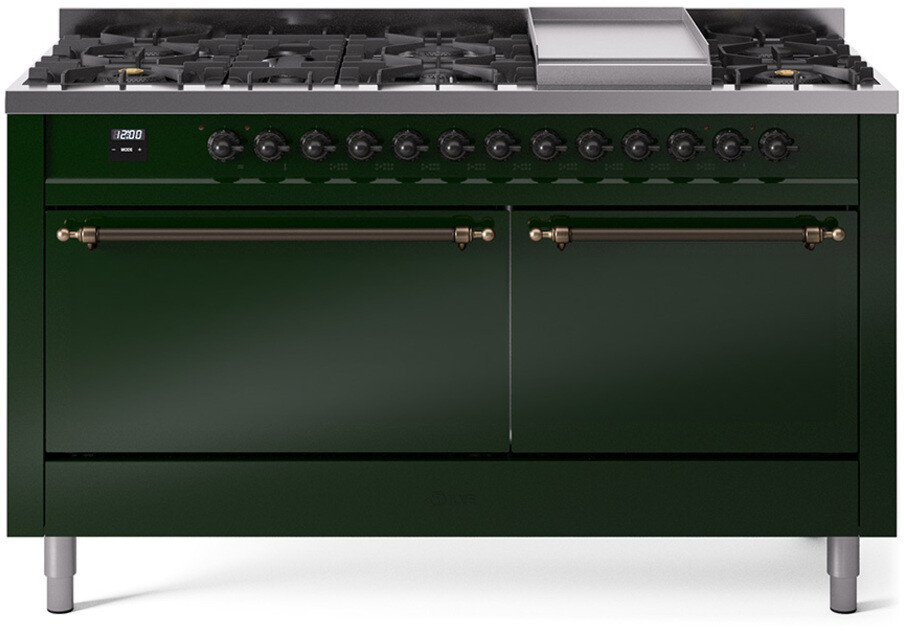 Freestanding Dual Fuel Range with 9 Sealed Burners, 5.8 cu. ft. Total Capacity, Storage Drawer, and Griddle: Emerald Green, Bronze Trim, Solid Door. Experience versatile cooking with nine sealed burners, providing a range of heat outputs for all your culinary needs. Enjoy ample space with a 5.8 cubic feet total oven capacity, perfect for preparing large meals and multiple dishes simultaneously. Conveniently store your cooking essentials within easy reach in the integrated storage drawer. Expand your cooking options with a built-in griddle, ideal for making pancakes, eggs, and grilled sandwiches. With power up to 25000 btu as standard. Optimal supply and perfect distribution of the heat, for all types of cooking. With non-stick nanotechnological treatment. The noble technical characteristics of brass are enriched with a nanotechnological coating that assures easy cleaning, with an elegant Total Black finish. Structure in AISI 304 steel with 12/10 thickness, option to choose the ideal combination between a gas hob with up to 9 burners or induction, mixed and in various setups. The indestructible cast iron pan supports provide a functional and safe support for the pots. The electronic control ensures that the temperature of the oven remains constant throughout, without fluctuating, as is the case in conventional ovens. It can be set with precision starting from 85F, for perfect proofing, up to 575F, for roasting. The door hinges are fitted with a shock absorber that makes the closure more gradual and noiseless. The quick oven preheating function allows it to reach the desired temperature in a short time and you can then choose the best-suited cooking mode for the dish. It also works as rapid defrosting when a low temperature is set (85F 105F). The grease does not stick to the surface and can therefore be cleaned more easily. Pizza function. Quick start. Multiple fan cooking. Intensive cooking. Fan grill cooking. Grill cooking with closed-door. Cooking from above. Cooking from below. Static normal cooking. Pizza function. Quick start. Multiple fan cooking. Intensive cooking. Fan grill cooking. Grill cooking with closed-door. Cooking from above. Cooking from below. Static normal cooking. Series: Nostalgie II. Noblesse Frames: No. Fuel Type: Dual Fuel. Gas Type: Natural Gas. Installation Type: Freestanding. Oven Total Capacity (cu. ft.): 5.8. Sabbath Mode: No. Number of Racks: 2. Drawer Type: Storage Drawer. Display Type: LCD Display. Timer: Yes. Cooking Probe: Yes. Rotisserie: Yes. Soft Close Door: Yes. Cooktop Configuration: 9 Sealed Burners + Griddle. Burner/Element Type: Sealed Burner. Griddle: Yes. Grill: No. Oven Control Type: Knobs. Oven Door Type: Solid Door. Number of Ovens: Double Oven. Main Oven Capacity (cu. ft.): 3.5. Second Oven Capacity (cu. ft.): 2.3. Oven Cleaning Type: Easy Clean Enamel Cavities. Main Oven Type: UOV 80 M. Second Oven Type: UOV 60 M. ADA Compliant: No. Star-K Certified: No. Voltage: 240 V. Amps: 30 A. Exterior Width: 60". Width: 59 1/2". Depth: 27". Height: 36 1/4" - 38 1/2".