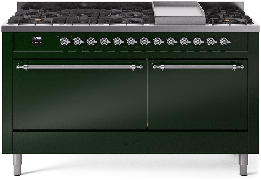 Freestanding Dual Fuel Range with 9 Sealed Burners, 5.8 cu. ft. Total Capacity, Storage Drawer, and Griddle: Emerald Green, Chrome Trim, Solid Door. Experience versatile cooking with nine sealed burners, providing a range of heat outputs for all your culinary needs. Enjoy ample space with a 5.8 cubic feet total oven capacity, perfect for preparing large meals and multiple dishes simultaneously. Conveniently store your cooking essentials within easy reach in the integrated storage drawer. Expand your cooking options with a built-in griddle, ideal for making pancakes, eggs, and grilled sandwiches. With power up to 25000 btu as standard. Optimal supply and perfect distribution of the heat, for all types of cooking. With non-stick nanotechnological treatment. The noble technical characteristics of brass are enriched with a nanotechnological coating that assures easy cleaning, with an elegant Total Black finish. Structure in AISI 304 steel with 12/10 thickness, option to choose the ideal combination between a gas hob with up to 9 burners or induction, mixed and in various setups. The indestructible cast iron pan supports provide a functional and safe support for the pots. The electronic control ensures that the temperature of the oven remains constant throughout, without fluctuating, as is the case in conventional ovens. It can be set with precision starting from 85F, for perfect proofing, up to 575F, for roasting. The door hinges are fitted with a shock absorber that makes the closure more gradual and noiseless. The quick oven preheating function allows it to reach the desired temperature in a short time and you can then choose the best-suited cooking mode for the dish. It also works as rapid defrosting when a low temperature is set (85F 105F). The grease does not stick to the surface and can therefore be cleaned more easily. Pizza function. Quick start. Multiple fan cooking. Intensive cooking. Fan grill cooking. Grill cooking with closed-door. Cooking from above. Cooking from below. Static normal cooking. Pizza function. Quick start. Multiple fan cooking. Intensive cooking. Fan grill cooking. Grill cooking with closed-door. Cooking from above. Cooking from below. Static normal cooking. Series: Nostalgie II. Noblesse Frames: No. Fuel Type: Dual Fuel. Gas Type: Natural Gas. Installation Type: Freestanding. Oven Total Capacity (cu. ft.): 5.8. Sabbath Mode: No. Number of Racks: 2. Drawer Type: Storage Drawer. Display Type: LCD Display. Timer: Yes. Cooking Probe: Yes. Rotisserie: Yes. Soft Close Door: Yes. Cooktop Configuration: 9 Sealed Burners + Griddle. Burner/Element Type: Sealed Burner. Griddle: Yes. Grill: No. Oven Control Type: Knobs. Oven Door Type: Solid Door. Number of Ovens: Double Oven. Main Oven Capacity (cu. ft.): 3.5. Second Oven Capacity (cu. ft.): 2.3. Oven Cleaning Type: Easy Clean Enamel Cavities. Main Oven Type: UOV 80 M. Second Oven Type: UOV 60 M. ADA Compliant: No. Star-K Certified: No. Voltage: 240 V. Amps: 30 A. Exterior Width: 60". Width: 59 1/2". Depth: 27". Height: 36 1/4" - 38 1/2".