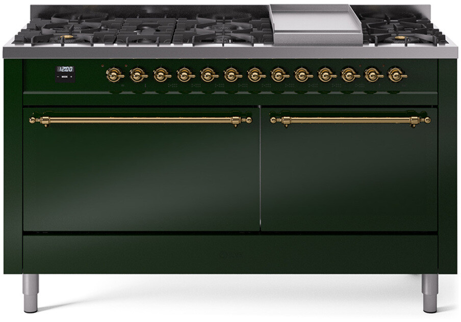 Freestanding Dual Fuel Range with 9 Sealed Burners, 5.8 cu. ft. Total Capacity, Storage Drawer, and Griddle: Emerald Green, Brass Trim, Solid Door. Experience versatile cooking with nine sealed burners, providing a range of heat outputs for all your culinary needs. Enjoy ample space with a 5.8 cubic feet total oven capacity, perfect for preparing large meals and multiple dishes simultaneously. Conveniently store your cooking essentials within easy reach in the integrated storage drawer. Expand your cooking options with a built-in griddle, ideal for making pancakes, eggs, and grilled sandwiches. With power up to 25000 btu as standard. Optimal supply and perfect distribution of the heat, for all types of cooking. With non-stick nanotechnological treatment. The noble technical characteristics of brass are enriched with a nanotechnological coating that assures easy cleaning, with an elegant Total Black finish. Structure in AISI 304 steel with 12/10 thickness, option to choose the ideal combination between a gas hob with up to 9 burners or induction, mixed and in various setups. The indestructible cast iron pan supports provide a functional and safe support for the pots. The electronic control ensures that the temperature of the oven remains constant throughout, without fluctuating, as is the case in conventional ovens. It can be set with precision starting from 85F, for perfect proofing, up to 575F, for roasting. The door hinges are fitted with a shock absorber that makes the closure more gradual and noiseless. The quick oven preheating function allows it to reach the desired temperature in a short time and you can then choose the best-suited cooking mode for the dish. It also works as rapid defrosting when a low temperature is set (85F 105F). The grease does not stick to the surface and can therefore be cleaned more easily. Pizza function. Quick start. Multiple fan cooking. Intensive cooking. Fan grill cooking. Grill cooking with closed-door. Cooking from above. Cooking from below. Static normal cooking. Pizza function. Quick start. Multiple fan cooking. Intensive cooking. Fan grill cooking. Grill cooking with closed-door. Cooking from above. Cooking from below. Static normal cooking. Series: Nostalgie II. Noblesse Frames: No. Fuel Type: Dual Fuel. Gas Type: Natural Gas. Installation Type: Freestanding. Oven Total Capacity (cu. ft.): 5.8. Sabbath Mode: No. Number of Racks: 2. Drawer Type: Storage Drawer. Display Type: LCD Display. Timer: Yes. Cooking Probe: Yes. Rotisserie: Yes. Soft Close Door: Yes. Cooktop Configuration: 9 Sealed Burners + Griddle. Burner/Element Type: Sealed Burner. Griddle: Yes. Grill: No. Oven Control Type: Knobs. Oven Door Type: Solid Door. Number of Ovens: Double Oven. Main Oven Capacity (cu. ft.): 3.5. Second Oven Capacity (cu. ft.): 2.3. Oven Cleaning Type: Easy Clean Enamel Cavities. Main Oven Type: UOV 80 M. Second Oven Type: UOV 60 M. ADA Compliant: No. Star-K Certified: No. Voltage: 240 V. Amps: 30 A. Exterior Width: 60". Width: 59 1/2". Depth: 27". Height: 36 1/4" - 38 1/2".