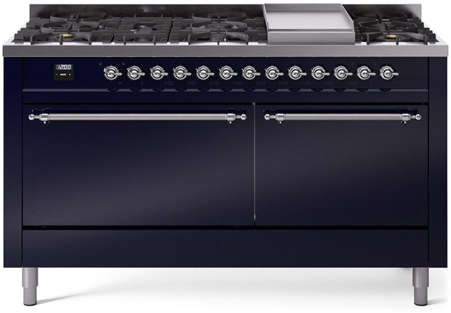 Freestanding Dual Fuel Range with 9 Sealed Burners, 5.8 cu. ft. Total Capacity, Storage Drawer, and Griddle: Midnight Blue, Chrome Trim, Solid Door. Experience versatile cooking with nine sealed burners, providing a range of heat outputs for all your culinary needs. Enjoy ample space with a 5.8 cubic feet total oven capacity, perfect for preparing large meals and multiple dishes simultaneously. Conveniently store your cooking essentials within easy reach in the integrated storage drawer. Expand your cooking options with a built-in griddle, ideal for making pancakes, eggs, and grilled sandwiches. With power up to 25000 btu as standard. Optimal supply and perfect distribution of the heat, for all types of cooking. With non-stick nanotechnological treatment. The noble technical characteristics of brass are enriched with a nanotechnological coating that assures easy cleaning, with an elegant Total Black finish. Structure in AISI 304 steel with 12/10 thickness, option to choose the ideal combination between a gas hob with up to 9 burners or induction, mixed and in various setups. The indestructible cast iron pan supports provide a functional and safe support for the pots. The electronic control ensures that the temperature of the oven remains constant throughout, without fluctuating, as is the case in conventional ovens. It can be set with precision starting from 85F, for perfect proofing, up to 575F, for roasting. The door hinges are fitted with a shock absorber that makes the closure more gradual and noiseless. The quick oven preheating function allows it to reach the desired temperature in a short time and you can then choose the best-suited cooking mode for the dish. It also works as rapid defrosting when a low temperature is set (85F 105F). The grease does not stick to the surface and can therefore be cleaned more easily. Pizza function. Quick start. Multiple fan cooking. Intensive cooking. Fan grill cooking. Grill cooking with closed-door. Cooking from above. Cooking from below. Static normal cooking. Pizza function. Quick start. Multiple fan cooking. Intensive cooking. Fan grill cooking. Grill cooking with closed-door. Cooking from above. Cooking from below. Static normal cooking. Series: Nostalgie II. Noblesse Frames: No. Fuel Type: Dual Fuel. Gas Type: Natural Gas. Installation Type: Freestanding. Oven Total Capacity (cu. ft.): 5.8. Sabbath Mode: No. Number of Racks: 2. Drawer Type: Storage Drawer. Display Type: LCD Display. Timer: Yes. Cooking Probe: Yes. Rotisserie: Yes. Soft Close Door: Yes. Cooktop Configuration: 9 Sealed Burners + Griddle. Burner/Element Type: Sealed Burner. Griddle: Yes. Grill: No. Oven Control Type: Knobs. Oven Door Type: Solid Door. Number of Ovens: Double Oven. Main Oven Capacity (cu. ft.): 3.5. Second Oven Capacity (cu. ft.): 2.3. Oven Cleaning Type: Easy Clean Enamel Cavities. Main Oven Type: UOV 80 M. Second Oven Type: UOV 60 M. ADA Compliant: No. Star-K Certified: No. Voltage: 240 V. Amps: 30 A. Exterior Width: 60". Width: 59 1/2". Depth: 27". Height: 36 1/4" - 38 1/2".