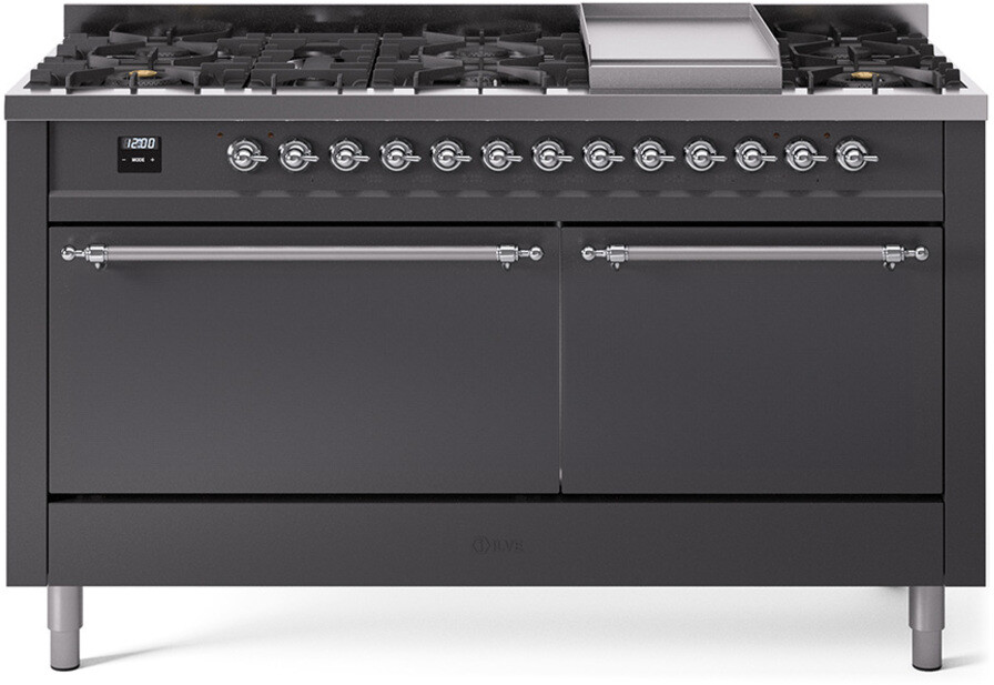 Freestanding Dual Fuel Range with 9 Sealed Burners, 5.8 cu. ft. Total Capacity, Storage Drawer, and Griddle: Graphite Matte, Chrome Trim, Solid Door. Experience versatile cooking with nine sealed burners, providing a range of heat outputs for all your culinary needs. Enjoy ample space with a 5.8 cubic feet total oven capacity, perfect for preparing large meals and multiple dishes simultaneously. Conveniently store your cooking essentials within easy reach in the integrated storage drawer. Expand your cooking options with a built-in griddle, ideal for making pancakes, eggs, and grilled sandwiches. With power up to 25000 btu as standard. Optimal supply and perfect distribution of the heat, for all types of cooking. With non-stick nanotechnological treatment. The noble technical characteristics of brass are enriched with a nanotechnological coating that assures easy cleaning, with an elegant Total Black finish. Structure in AISI 304 steel with 12/10 thickness, option to choose the ideal combination between a gas hob with up to 9 burners or induction, mixed and in various setups. The indestructible cast iron pan supports provide a functional and safe support for the pots. The electronic control ensures that the temperature of the oven remains constant throughout, without fluctuating, as is the case in conventional ovens. It can be set with precision starting from 85F, for perfect proofing, up to 575F, for roasting. The door hinges are fitted with a shock absorber that makes the closure more gradual and noiseless. The quick oven preheating function allows it to reach the desired temperature in a short time and you can then choose the best-suited cooking mode for the dish. It also works as rapid defrosting when a low temperature is set (85F 105F). The grease does not stick to the surface and can therefore be cleaned more easily. Pizza function. Quick start. Multiple fan cooking. Intensive cooking. Fan grill cooking. Grill cooking with closed-door. Cooking from above. Cooking from below. Static normal cooking. Pizza function. Quick start. Multiple fan cooking. Intensive cooking. Fan grill cooking. Grill cooking with closed-door. Cooking from above. Cooking from below. Static normal cooking. Series: Nostalgie II. Noblesse Frames: No. Fuel Type: Dual Fuel. Gas Type: Natural Gas. Installation Type: Freestanding. Oven Total Capacity (cu. ft.): 5.8. Sabbath Mode: No. Number of Racks: 2. Drawer Type: Storage Drawer. Display Type: LCD Display. Timer: Yes. Cooking Probe: Yes. Rotisserie: Yes. Soft Close Door: Yes. Cooktop Configuration: 9 Sealed Burners + Griddle. Burner/Element Type: Sealed Burner. Griddle: Yes. Grill: No. Oven Control Type: Knobs. Oven Door Type: Solid Door. Number of Ovens: Double Oven. Main Oven Capacity (cu. ft.): 3.5. Second Oven Capacity (cu. ft.): 2.3. Oven Cleaning Type: Easy Clean Enamel Cavities. Main Oven Type: UOV 80 M. Second Oven Type: UOV 60 M. ADA Compliant: No. Star-K Certified: No. Voltage: 240 V. Amps: 30 A. Exterior Width: 60". Width: 59 1/2". Depth: 27". Height: 36 1/4" - 38 1/2".