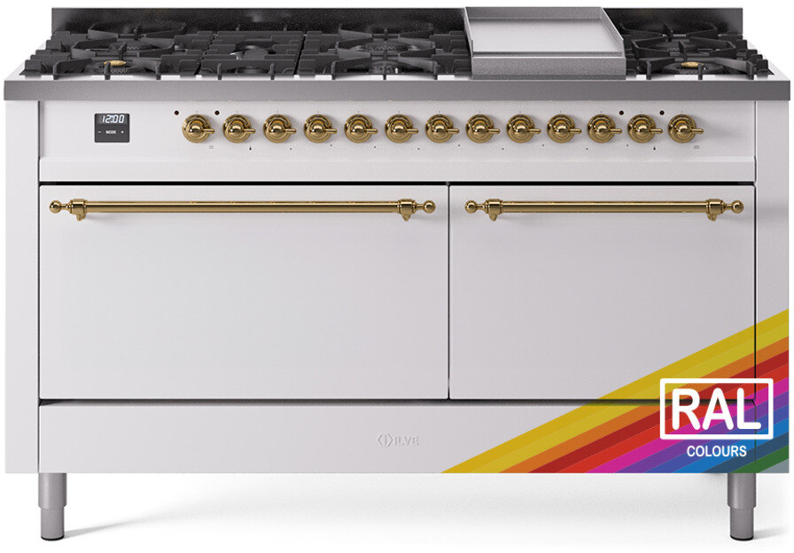 Freestanding Dual Fuel Range with 9 Sealed Burners, 5.8 cu. ft. Total Capacity, Storage Drawer, and Griddle: RAL Color, Brass Trim, Solid Door. Experience versatile cooking with nine sealed burners, providing a range of heat outputs for all your culinary needs. Enjoy ample space with a 5.8 cubic feet total oven capacity, perfect for preparing large meals and multiple dishes simultaneously. Conveniently store your cooking essentials within easy reach in the integrated storage drawer. Expand your cooking options with a built-in griddle, ideal for making pancakes, eggs, and grilled sandwiches. With power up to 25000 btu as standard. Optimal supply and perfect distribution of the heat, for all types of cooking. With non-stick nanotechnological treatment. The noble technical characteristics of brass are enriched with a nanotechnological coating that assures easy cleaning, with an elegant Total Black finish. Structure in AISI 304 steel with 12/10 thickness, option to choose the ideal combination between a gas hob with up to 9 burners or induction, mixed and in various setups. The indestructible cast iron pan supports provide a functional and safe support for the pots. The electronic control ensures that the temperature of the oven remains constant throughout, without fluctuating, as is the case in conventional ovens. It can be set with precision starting from 85F, for perfect proofing, up to 575F, for roasting. The door hinges are fitted with a shock absorber that makes the closure more gradual and noiseless. The quick oven preheating function allows it to reach the desired temperature in a short time and you can then choose the best-suited cooking mode for the dish. It also works as rapid defrosting when a low temperature is set (85F 105F). The grease does not stick to the surface and can therefore be cleaned more easily. Pizza function. Quick start. Multiple fan cooking. Intensive cooking. Fan grill cooking. Grill cooking with closed-door. Cooking from above. Cooking from below. Static normal cooking. Pizza function. Quick start. Multiple fan cooking. Intensive cooking. Fan grill cooking. Grill cooking with closed-door. Cooking from above. Cooking from below. Static normal cooking. Series: Nostalgie II. Noblesse Frames: No. Fuel Type: Dual Fuel. Gas Type: Natural Gas. Installation Type: Freestanding. Oven Total Capacity (cu. ft.): 5.8. Sabbath Mode: No. Number of Racks: 2. Drawer Type: Storage Drawer. Display Type: LCD Display. Timer: Yes. Cooking Probe: Yes. Rotisserie: Yes. Soft Close Door: Yes. Cooktop Configuration: 9 Sealed Burners + Griddle. Burner/Element Type: Sealed Burner. Griddle: Yes. Grill: No. Oven Control Type: Knobs. Oven Door Type: Solid Door. Number of Ovens: Double Oven. Main Oven Capacity (cu. ft.): 3.5. Second Oven Capacity (cu. ft.): 2.3. Oven Cleaning Type: Easy Clean Enamel Cavities. Main Oven Type: UOV 80 M. Second Oven Type: UOV 60 M. ADA Compliant: No. Star-K Certified: No. Voltage: 240 V. Amps: 30 A. Exterior Width: 60". Width: 59 1/2". Depth: 27". Height: 36 1/4" - 38 1/2".