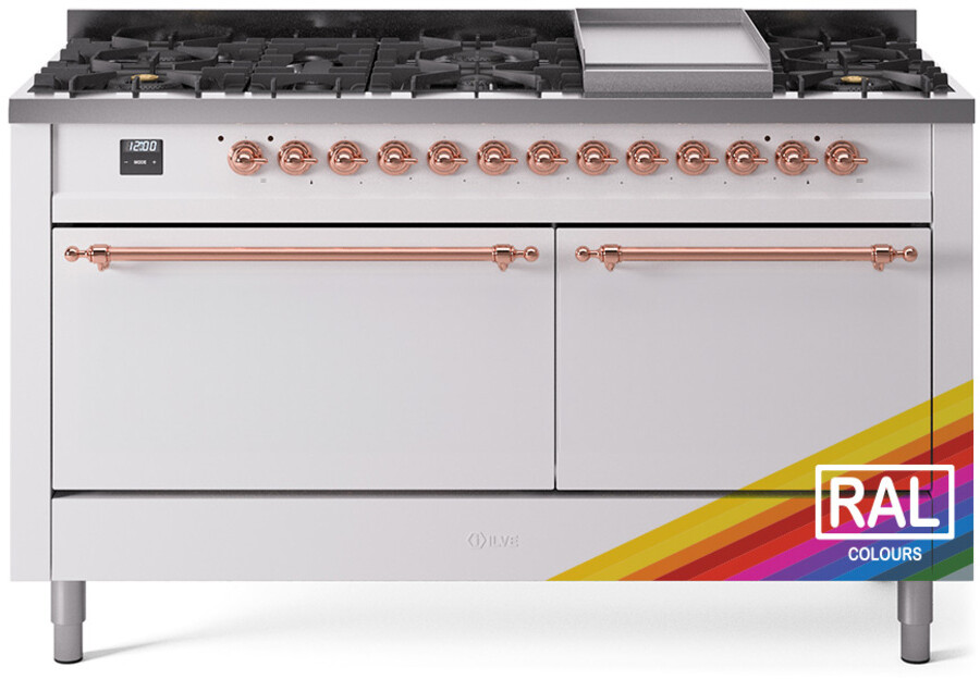 Freestanding Dual Fuel Range with 9 Sealed Burners, 5.8 cu. ft. Total Capacity, Storage Drawer, and Griddle: RAL Color, Copper Trim, Solid Door. Experience versatile cooking with nine sealed burners, providing a range of heat outputs for all your culinary needs. Enjoy ample space with a 5.8 cubic feet total oven capacity, perfect for preparing large meals and multiple dishes simultaneously. Conveniently store your cooking essentials within easy reach in the integrated storage drawer. Expand your cooking options with a built-in griddle, ideal for making pancakes, eggs, and grilled sandwiches. With power up to 25000 btu as standard. Optimal supply and perfect distribution of the heat, for all types of cooking. With non-stick nanotechnological treatment. The noble technical characteristics of brass are enriched with a nanotechnological coating that assures easy cleaning, with an elegant Total Black finish. Structure in AISI 304 steel with 12/10 thickness, option to choose the ideal combination between a gas hob with up to 9 burners or induction, mixed and in various setups. The indestructible cast iron pan supports provide a functional and safe support for the pots. The electronic control ensures that the temperature of the oven remains constant throughout, without fluctuating, as is the case in conventional ovens. It can be set with precision starting from 85F, for perfect proofing, up to 575F, for roasting. The door hinges are fitted with a shock absorber that makes the closure more gradual and noiseless. The quick oven preheating function allows it to reach the desired temperature in a short time and you can then choose the best-suited cooking mode for the dish. It also works as rapid defrosting when a low temperature is set (85F 105F). The grease does not stick to the surface and can therefore be cleaned more easily. Pizza function. Quick start. Multiple fan cooking. Intensive cooking. Fan grill cooking. Grill cooking with closed-door. Cooking from above. Cooking from below. Static normal cooking. Pizza function. Quick start. Multiple fan cooking. Intensive cooking. Fan grill cooking. Grill cooking with closed-door. Cooking from above. Cooking from below. Static normal cooking. Series: Nostalgie II. Noblesse Frames: No. Fuel Type: Dual Fuel. Gas Type: Natural Gas. Installation Type: Freestanding. Oven Total Capacity (cu. ft.): 5.8. Sabbath Mode: No. Number of Racks: 2. Drawer Type: Storage Drawer. Display Type: LCD Display. Timer: Yes. Cooking Probe: Yes. Rotisserie: Yes. Soft Close Door: Yes. Cooktop Configuration: 9 Sealed Burners + Griddle. Burner/Element Type: Sealed Burner. Griddle: Yes. Grill: No. Oven Control Type: Knobs. Oven Door Type: Solid Door. Number of Ovens: Double Oven. Main Oven Capacity (cu. ft.): 3.5. Second Oven Capacity (cu. ft.): 2.3. Oven Cleaning Type: Easy Clean Enamel Cavities. Main Oven Type: UOV 80 M. Second Oven Type: UOV 60 M. ADA Compliant: No. Star-K Certified: No. Voltage: 240 V. Amps: 30 A. Exterior Width: 60". Width: 59 1/2". Depth: 27". Height: 36 1/4" - 38 1/2".