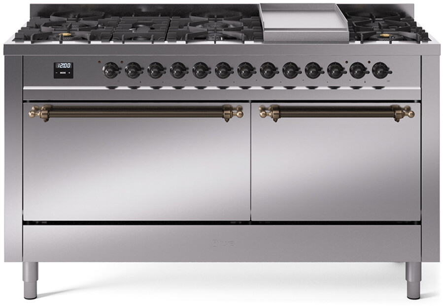Freestanding Dual Fuel Range with 9 Sealed Burners, 5.8 cu. ft. Total Capacity, Storage Drawer, and Griddle: Stainless Steel, Bronze Trim, Solid Door. Experience versatile cooking with nine sealed burners, providing a range of heat outputs for all your culinary needs. Enjoy ample space with a 5.8 cubic feet total oven capacity, perfect for preparing large meals and multiple dishes simultaneously. Conveniently store your cooking essentials within easy reach in the integrated storage drawer. Expand your cooking options with a built-in griddle, ideal for making pancakes, eggs, and grilled sandwiches. With power up to 25000 btu as standard. Optimal supply and perfect distribution of the heat, for all types of cooking. With non-stick nanotechnological treatment. The noble technical characteristics of brass are enriched with a nanotechnological coating that assures easy cleaning, with an elegant Total Black finish. Structure in AISI 304 steel with 12/10 thickness, option to choose the ideal combination between a gas hob with up to 9 burners or induction, mixed and in various setups. The indestructible cast iron pan supports provide a functional and safe support for the pots. The electronic control ensures that the temperature of the oven remains constant throughout, without fluctuating, as is the case in conventional ovens. It can be set with precision starting from 85F, for perfect proofing, up to 575F, for roasting. The door hinges are fitted with a shock absorber that makes the closure more gradual and noiseless. The quick oven preheating function allows it to reach the desired temperature in a short time and you can then choose the best-suited cooking mode for the dish. It also works as rapid defrosting when a low temperature is set (85F 105F). The grease does not stick to the surface and can therefore be cleaned more easily. Pizza function. Quick start. Multiple fan cooking. Intensive cooking. Fan grill cooking. Grill cooking with closed-door. Cooking from above. Cooking from below. Static normal cooking. Pizza function. Quick start. Multiple fan cooking. Intensive cooking. Fan grill cooking. Grill cooking with closed-door. Cooking from above. Cooking from below. Static normal cooking. Series: Nostalgie II. Noblesse Frames: No. Fuel Type: Dual Fuel. Gas Type: Natural Gas. Installation Type: Freestanding. Oven Total Capacity (cu. ft.): 5.8. Sabbath Mode: No. Number of Racks: 2. Drawer Type: Storage Drawer. Display Type: LCD Display. Timer: Yes. Cooking Probe: Yes. Rotisserie: Yes. Soft Close Door: Yes. Cooktop Configuration: 9 Sealed Burners + Griddle. Burner/Element Type: Sealed Burner. Griddle: Yes. Grill: No. Oven Control Type: Knobs. Oven Door Type: Solid Door. Number of Ovens: Double Oven. Main Oven Capacity (cu. ft.): 3.5. Second Oven Capacity (cu. ft.): 2.3. Oven Cleaning Type: Easy Clean Enamel Cavities. Main Oven Type: UOV 80 M. Second Oven Type: UOV 60 M. ADA Compliant: No. Star-K Certified: No. Voltage: 240 V. Amps: 30 A. Exterior Width: 60". Width: 59 1/2". Depth: 27". Height: 36 1/4" - 38 1/2".
