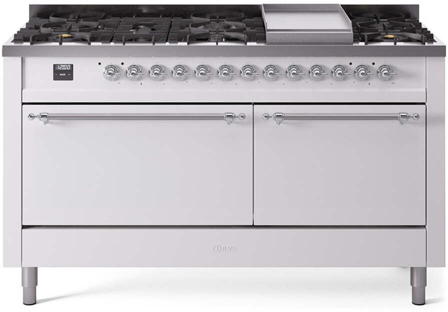 Freestanding Dual Fuel Range with 9 Sealed Burners, 5.8 cu. ft. Total Capacity, Storage Drawer, and Griddle: White, Chrome Trim, Solid Door. Experience versatile cooking with nine sealed burners, providing a range of heat outputs for all your culinary needs. Enjoy ample space with a 5.8 cubic feet total oven capacity, perfect for preparing large meals and multiple dishes simultaneously. Conveniently store your cooking essentials within easy reach in the integrated storage drawer. Expand your cooking options with a built-in griddle, ideal for making pancakes, eggs, and grilled sandwiches. With power up to 25000 btu as standard. Optimal supply and perfect distribution of the heat, for all types of cooking. With non-stick nanotechnological treatment. The noble technical characteristics of brass are enriched with a nanotechnological coating that assures easy cleaning, with an elegant Total Black finish. Structure in AISI 304 steel with 12/10 thickness, option to choose the ideal combination between a gas hob with up to 9 burners or induction, mixed and in various setups. The indestructible cast iron pan supports provide a functional and safe support for the pots. The electronic control ensures that the temperature of the oven remains constant throughout, without fluctuating, as is the case in conventional ovens. It can be set with precision starting from 85F, for perfect proofing, up to 575F, for roasting. The door hinges are fitted with a shock absorber that makes the closure more gradual and noiseless. The quick oven preheating function allows it to reach the desired temperature in a short time and you can then choose the best-suited cooking mode for the dish. It also works as rapid defrosting when a low temperature is set (85F 105F). The grease does not stick to the surface and can therefore be cleaned more easily. Pizza function. Quick start. Multiple fan cooking. Intensive cooking. Fan grill cooking. Grill cooking with closed-door. Cooking from above. Cooking from below. Static normal cooking. Pizza function. Quick start. Multiple fan cooking. Intensive cooking. Fan grill cooking. Grill cooking with closed-door. Cooking from above. Cooking from below. Static normal cooking. Series: Nostalgie II. Noblesse Frames: No. Fuel Type: Dual Fuel. Gas Type: Natural Gas. Installation Type: Freestanding. Oven Total Capacity (cu. ft.): 5.8. Sabbath Mode: No. Number of Racks: 2. Drawer Type: Storage Drawer. Display Type: LCD Display. Timer: Yes. Cooking Probe: Yes. Rotisserie: Yes. Soft Close Door: Yes. Cooktop Configuration: 9 Sealed Burners + Griddle. Burner/Element Type: Sealed Burner. Griddle: Yes. Grill: No. Oven Control Type: Knobs. Oven Door Type: Solid Door. Number of Ovens: Double Oven. Main Oven Capacity (cu. ft.): 3.5. Second Oven Capacity (cu. ft.): 2.3. Oven Cleaning Type: Easy Clean Enamel Cavities. Main Oven Type: UOV 80 M. Second Oven Type: UOV 60 M. ADA Compliant: No. Star-K Certified: No. Voltage: 240 V. Amps: 30 A. Exterior Width: 60". Width: 59 1/2". Depth: 27". Height: 36 1/4" - 38 1/2".