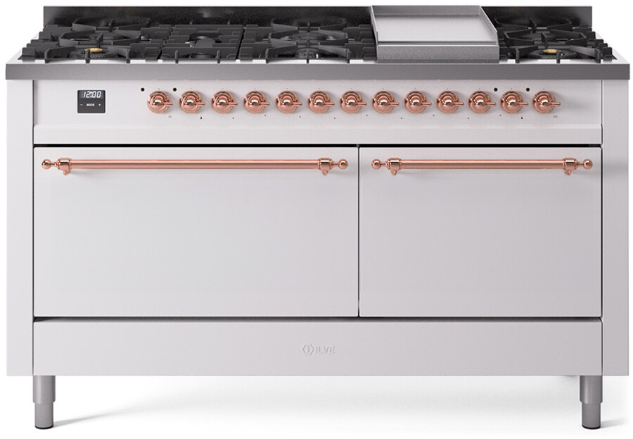 Freestanding Dual Fuel Range with 9 Sealed Burners, 5.8 cu. ft. Total Capacity, Storage Drawer, and Griddle: White, Copper Trim, Solid Door. Experience versatile cooking with nine sealed burners, providing a range of heat outputs for all your culinary needs. Enjoy ample space with a 5.8 cubic feet total oven capacity, perfect for preparing large meals and multiple dishes simultaneously. Conveniently store your cooking essentials within easy reach in the integrated storage drawer. Expand your cooking options with a built-in griddle, ideal for making pancakes, eggs, and grilled sandwiches. With power up to 25000 btu as standard. Optimal supply and perfect distribution of the heat, for all types of cooking. With non-stick nanotechnological treatment. The noble technical characteristics of brass are enriched with a nanotechnological coating that assures easy cleaning, with an elegant Total Black finish. Structure in AISI 304 steel with 12/10 thickness, option to choose the ideal combination between a gas hob with up to 9 burners or induction, mixed and in various setups. The indestructible cast iron pan supports provide a functional and safe support for the pots. The electronic control ensures that the temperature of the oven remains constant throughout, without fluctuating, as is the case in conventional ovens. It can be set with precision starting from 85F, for perfect proofing, up to 575F, for roasting. The door hinges are fitted with a shock absorber that makes the closure more gradual and noiseless. The quick oven preheating function allows it to reach the desired temperature in a short time and you can then choose the best-suited cooking mode for the dish. It also works as rapid defrosting when a low temperature is set (85F 105F). The grease does not stick to the surface and can therefore be cleaned more easily. Pizza function. Quick start. Multiple fan cooking. Intensive cooking. Fan grill cooking. Grill cooking with closed-door. Cooking from above. Cooking from below. Static normal cooking. Pizza function. Quick start. Multiple fan cooking. Intensive cooking. Fan grill cooking. Grill cooking with closed-door. Cooking from above. Cooking from below. Static normal cooking. Series: Nostalgie II. Noblesse Frames: No. Fuel Type: Dual Fuel. Gas Type: Natural Gas. Installation Type: Freestanding. Oven Total Capacity (cu. ft.): 5.8. Sabbath Mode: No. Number of Racks: 2. Drawer Type: Storage Drawer. Display Type: LCD Display. Timer: Yes. Cooking Probe: Yes. Rotisserie: Yes. Soft Close Door: Yes. Cooktop Configuration: 9 Sealed Burners + Griddle. Burner/Element Type: Sealed Burner. Griddle: Yes. Grill: No. Oven Control Type: Knobs. Oven Door Type: Solid Door. Number of Ovens: Double Oven. Main Oven Capacity (cu. ft.): 3.5. Second Oven Capacity (cu. ft.): 2.3. Oven Cleaning Type: Easy Clean Enamel Cavities. Main Oven Type: UOV 80 M. Second Oven Type: UOV 60 M. ADA Compliant: No. Star-K Certified: No. Voltage: 240 V. Amps: 30 A. Exterior Width: 60". Width: 59 1/2". Depth: 27". Height: 36 1/4" - 38 1/2".
