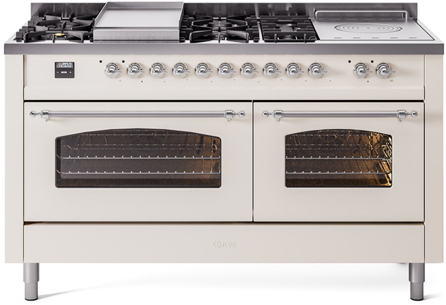 Freestanding Dual Fuel Range with 7 Sealed Burners, 5.8 cu. ft. Total Capacity, Storage Drawer, Griddle, and French Top: Antique White, Chrome Trim, Triple Glass Door. Enjoy the flexibility of seven sealed burners, offering a variety of heat settings to meet all your cooking needs. With 5.8 cubic feet of total oven capacity, you can effortlessly prepare large meals and multiple dishes at once. Keep your kitchen essentials organized and within easy reach with the convenient storage drawer. Cook up delicious breakfasts and more on the built-in griddle, perfect for pancakes, eggs, and grilled sandwiches. Achieve exceptional cooking precision with the French top, ideal for simmering and maintaining gentle heat. With power up to 25000 btu as standard. Optimal supply and perfect distribution of the heat, for all types of cooking. With non-stick nanotechnological treatment. The noble technical characteristics of brass are enriched with a nanotechnological coating that assures easy cleaning, with an elegant Total Black finish. Structure in AISI 304 steel with 12/10 thickness, option to choose the ideal combination between a gas hob with up to 9 burners or induction, mixed and in various setups. The indestructible cast iron pan supports provide a functional and safe support for the pots. The electronic control ensures that the temperature of the oven remains constant throughout, without fluctuating, as is the case in conventional ovens. It can be set with precision starting from 85F, for perfect proofing, up to 575F, for roasting. The door hinges are fitted with a shock absorber that makes the closure more gradual and noiseless. The quick oven preheating function allows it to reach the desired temperature in a short time and you can then choose the best-suited cooking mode for the dish. It also works as rapid defrosting when a low temperature is set (85F 105F). The grease does not stick to the surface and can therefore be cleaned more easily. Pizza function. Quick start. Multiple fan cooking. Intensive cooking. Fan grill cooking. Grill cooking with closed-door. Cooking from above. Cooking from below. Static normal cooking. Pizza function. Quick start. Multiple fan cooking. Intensive cooking. Fan grill cooking. Grill cooking with closed-door. Cooking from above. Cooking from below. Static normal cooking. Series: Nostalgie II. Noblesse Frames: No. Fuel Type: Dual Fuel. Gas Type: Natural Gas. Installation Type: Freestanding. Oven Total Capacity (cu. ft.): 5.8. Sabbath Mode: No. Number of Racks: 2. Drawer Type: Storage Drawer. Display Type: LCD Display. Timer: Yes. Cooking Probe: Yes. Rotisserie: Yes. Soft Close Door: Yes. Cooktop Configuration: 7 Sealed Burners + Griddle + French Top. Burner/Element Type: Sealed Burner. Griddle: Yes. Grill: No. Oven Control Type: Knobs. Oven Door Type: Triple Glass Door. Number of Ovens: Double Oven. Main Oven Capacity (cu. ft.): 3.5. Second Oven Capacity (cu. ft.): 2.3. Oven Cleaning Type: Easy Clean Enamel Cavities. Main Oven Type: UOV 80 M. Second Oven Type: UOV 60 M. ADA Compliant: No. Star-K Certified: No. Voltage: 240 V. Amps: 30 A. Exterior Width: 60". Width: 59 1/2". Depth: 27". Height: 36 1/4" - 38 1/2".