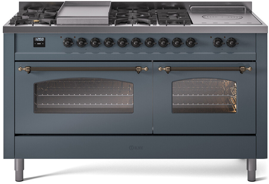 Freestanding Dual Fuel Range with 7 Sealed Burners, 5.8 cu. ft. Total Capacity, Storage Drawer, Griddle, and French Top: Blue Grey, Bronze Trim, Triple Glass Door. Enjoy the flexibility of seven sealed burners, offering a variety of heat settings to meet all your cooking needs. With 5.8 cubic feet of total oven capacity, you can effortlessly prepare large meals and multiple dishes at once. Keep your kitchen essentials organized and within easy reach with the convenient storage drawer. Cook up delicious breakfasts and more on the built-in griddle, perfect for pancakes, eggs, and grilled sandwiches. Achieve exceptional cooking precision with the French top, ideal for simmering and maintaining gentle heat. With power up to 25000 btu as standard. Optimal supply and perfect distribution of the heat, for all types of cooking. With non-stick nanotechnological treatment. The noble technical characteristics of brass are enriched with a nanotechnological coating that assures easy cleaning, with an elegant Total Black finish. Structure in AISI 304 steel with 12/10 thickness, option to choose the ideal combination between a gas hob with up to 9 burners or induction, mixed and in various setups. The indestructible cast iron pan supports provide a functional and safe support for the pots. The electronic control ensures that the temperature of the oven remains constant throughout, without fluctuating, as is the case in conventional ovens. It can be set with precision starting from 85F, for perfect proofing, up to 575F, for roasting. The door hinges are fitted with a shock absorber that makes the closure more gradual and noiseless. The quick oven preheating function allows it to reach the desired temperature in a short time and you can then choose the best-suited cooking mode for the dish. It also works as rapid defrosting when a low temperature is set (85F 105F). The grease does not stick to the surface and can therefore be cleaned more easily. Pizza function. Quick start. Multiple fan cooking. Intensive cooking. Fan grill cooking. Grill cooking with closed-door. Cooking from above. Cooking from below. Static normal cooking. Pizza function. Quick start. Multiple fan cooking. Intensive cooking. Fan grill cooking. Grill cooking with closed-door. Cooking from above. Cooking from below. Static normal cooking. Series: Nostalgie II. Noblesse Frames: No. Fuel Type: Dual Fuel. Gas Type: Natural Gas. Installation Type: Freestanding. Oven Total Capacity (cu. ft.): 5.8. Sabbath Mode: No. Number of Racks: 2. Drawer Type: Storage Drawer. Display Type: LCD Display. Timer: Yes. Cooking Probe: Yes. Rotisserie: Yes. Soft Close Door: Yes. Cooktop Configuration: 7 Sealed Burners + Griddle + French Top. Burner/Element Type: Sealed Burner. Griddle: Yes. Grill: No. Oven Control Type: Knobs. Oven Door Type: Triple Glass Door. Number of Ovens: Double Oven. Main Oven Capacity (cu. ft.): 3.5. Second Oven Capacity (cu. ft.): 2.3. Oven Cleaning Type: Easy Clean Enamel Cavities. Main Oven Type: UOV 80 M. Second Oven Type: UOV 60 M. ADA Compliant: No. Star-K Certified: No. Voltage: 240 V. Amps: 30 A. Exterior Width: 60". Width: 59 1/2". Depth: 27". Height: 36 1/4" - 38 1/2".