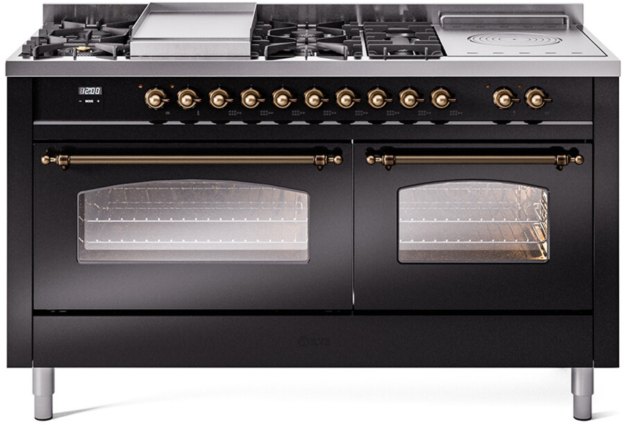 Freestanding Dual Fuel Range with 7 Sealed Burners, 5.8 cu. ft. Total Capacity, Storage Drawer, Griddle, and French Top: Glossy Black, Bronze Trim, Triple Glass Door. Enjoy the flexibility of seven sealed burners, offering a variety of heat settings to meet all your cooking needs. With 5.8 cubic feet of total oven capacity, you can effortlessly prepare large meals and multiple dishes at once. Keep your kitchen essentials organized and within easy reach with the convenient storage drawer. Cook up delicious breakfasts and more on the built-in griddle, perfect for pancakes, eggs, and grilled sandwiches. Achieve exceptional cooking precision with the French top, ideal for simmering and maintaining gentle heat. With power up to 25000 btu as standard. Optimal supply and perfect distribution of the heat, for all types of cooking. With non-stick nanotechnological treatment. The noble technical characteristics of brass are enriched with a nanotechnological coating that assures easy cleaning, with an elegant Total Black finish. Structure in AISI 304 steel with 12/10 thickness, option to choose the ideal combination between a gas hob with up to 9 burners or induction, mixed and in various setups. The indestructible cast iron pan supports provide a functional and safe support for the pots. The electronic control ensures that the temperature of the oven remains constant throughout, without fluctuating, as is the case in conventional ovens. It can be set with precision starting from 85F, for perfect proofing, up to 575F, for roasting. The door hinges are fitted with a shock absorber that makes the closure more gradual and noiseless. The quick oven preheating function allows it to reach the desired temperature in a short time and you can then choose the best-suited cooking mode for the dish. It also works as rapid defrosting when a low temperature is set (85F 105F). The grease does not stick to the surface and can therefore be cleaned more easily. Pizza function. Quick start. Multiple fan cooking. Intensive cooking. Fan grill cooking. Grill cooking with closed-door. Cooking from above. Cooking from below. Static normal cooking. Pizza function. Quick start. Multiple fan cooking. Intensive cooking. Fan grill cooking. Grill cooking with closed-door. Cooking from above. Cooking from below. Static normal cooking. Series: Nostalgie II. Noblesse Frames: No. Fuel Type: Dual Fuel. Gas Type: Natural Gas. Installation Type: Freestanding. Oven Total Capacity (cu. ft.): 5.8. Sabbath Mode: No. Number of Racks: 2. Drawer Type: Storage Drawer. Display Type: LCD Display. Timer: Yes. Cooking Probe: Yes. Rotisserie: Yes. Soft Close Door: Yes. Cooktop Configuration: 7 Sealed Burners + Griddle + French Top. Burner/Element Type: Sealed Burner. Griddle: Yes. Grill: No. Oven Control Type: Knobs. Oven Door Type: Triple Glass Door. Number of Ovens: Double Oven. Main Oven Capacity (cu. ft.): 3.5. Second Oven Capacity (cu. ft.): 2.3. Oven Cleaning Type: Easy Clean Enamel Cavities. Main Oven Type: UOV 80 M. Second Oven Type: UOV 60 M. ADA Compliant: No. Star-K Certified: No. Voltage: 240 V. Amps: 30 A. Exterior Width: 60". Width: 59 1/2". Depth: 27". Height: 36 1/4" - 38 1/2".
