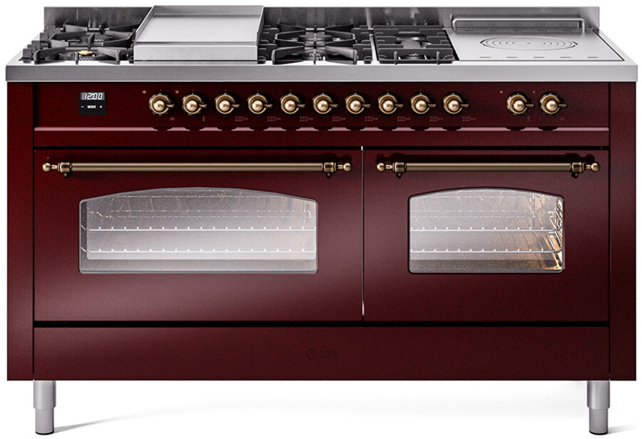 Freestanding Dual Fuel Range with 7 Sealed Burners, 5.8 cu. ft. Total Capacity, Storage Drawer, Griddle, and French Top: Burgundy, Bronze Trim, Triple Glass Door. Enjoy the flexibility of seven sealed burners, offering a variety of heat settings to meet all your cooking needs. With 5.8 cubic feet of total oven capacity, you can effortlessly prepare large meals and multiple dishes at once. Keep your kitchen essentials organized and within easy reach with the convenient storage drawer. Cook up delicious breakfasts and more on the built-in griddle, perfect for pancakes, eggs, and grilled sandwiches. Achieve exceptional cooking precision with the French top, ideal for simmering and maintaining gentle heat. With power up to 25000 btu as standard. Optimal supply and perfect distribution of the heat, for all types of cooking. With non-stick nanotechnological treatment. The noble technical characteristics of brass are enriched with a nanotechnological coating that assures easy cleaning, with an elegant Total Black finish. Structure in AISI 304 steel with 12/10 thickness, option to choose the ideal combination between a gas hob with up to 9 burners or induction, mixed and in various setups. The indestructible cast iron pan supports provide a functional and safe support for the pots. The electronic control ensures that the temperature of the oven remains constant throughout, without fluctuating, as is the case in conventional ovens. It can be set with precision starting from 85F, for perfect proofing, up to 575F, for roasting. The door hinges are fitted with a shock absorber that makes the closure more gradual and noiseless. The quick oven preheating function allows it to reach the desired temperature in a short time and you can then choose the best-suited cooking mode for the dish. It also works as rapid defrosting when a low temperature is set (85F 105F). The grease does not stick to the surface and can therefore be cleaned more easily. Pizza function. Quick start. Multiple fan cooking. Intensive cooking. Fan grill cooking. Grill cooking with closed-door. Cooking from above. Cooking from below. Static normal cooking. Pizza function. Quick start. Multiple fan cooking. Intensive cooking. Fan grill cooking. Grill cooking with closed-door. Cooking from above. Cooking from below. Static normal cooking. Series: Nostalgie II. Noblesse Frames: No. Fuel Type: Dual Fuel. Gas Type: Natural Gas. Installation Type: Freestanding. Oven Total Capacity (cu. ft.): 5.8. Sabbath Mode: No. Number of Racks: 2. Drawer Type: Storage Drawer. Display Type: LCD Display. Timer: Yes. Cooking Probe: Yes. Rotisserie: Yes. Soft Close Door: Yes. Cooktop Configuration: 7 Sealed Burners + Griddle + French Top. Burner/Element Type: Sealed Burner. Griddle: Yes. Grill: No. Oven Control Type: Knobs. Oven Door Type: Triple Glass Door. Number of Ovens: Double Oven. Main Oven Capacity (cu. ft.): 3.5. Second Oven Capacity (cu. ft.): 2.3. Oven Cleaning Type: Easy Clean Enamel Cavities. Main Oven Type: UOV 80 M. Second Oven Type: UOV 60 M. ADA Compliant: No. Star-K Certified: No. Voltage: 240 V. Amps: 30 A. Exterior Width: 60". Width: 59 1/2". Depth: 27". Height: 36 1/4" - 38 1/2".