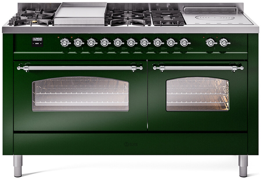 Freestanding Dual Fuel Range with 7 Sealed Burners, 5.8 cu. ft. Total Capacity, Storage Drawer, Griddle, and French Top: Emerald Green, Chrome Trim, Triple Glass Door. Enjoy the flexibility of seven sealed burners, offering a variety of heat settings to meet all your cooking needs. With 5.8 cubic feet of total oven capacity, you can effortlessly prepare large meals and multiple dishes at once. Keep your kitchen essentials organized and within easy reach with the convenient storage drawer. Cook up delicious breakfasts and more on the built-in griddle, perfect for pancakes, eggs, and grilled sandwiches. Achieve exceptional cooking precision with the French top, ideal for simmering and maintaining gentle heat. With power up to 25000 btu as standard. Optimal supply and perfect distribution of the heat, for all types of cooking. With non-stick nanotechnological treatment. The noble technical characteristics of brass are enriched with a nanotechnological coating that assures easy cleaning, with an elegant Total Black finish. Structure in AISI 304 steel with 12/10 thickness, option to choose the ideal combination between a gas hob with up to 9 burners or induction, mixed and in various setups. The indestructible cast iron pan supports provide a functional and safe support for the pots. The electronic control ensures that the temperature of the oven remains constant throughout, without fluctuating, as is the case in conventional ovens. It can be set with precision starting from 85F, for perfect proofing, up to 575F, for roasting. The door hinges are fitted with a shock absorber that makes the closure more gradual and noiseless. The quick oven preheating function allows it to reach the desired temperature in a short time and you can then choose the best-suited cooking mode for the dish. It also works as rapid defrosting when a low temperature is set (85F 105F). The grease does not stick to the surface and can therefore be cleaned more easily. Pizza function. Quick start. Multiple fan cooking. Intensive cooking. Fan grill cooking. Grill cooking with closed-door. Cooking from above. Cooking from below. Static normal cooking. Pizza function. Quick start. Multiple fan cooking. Intensive cooking. Fan grill cooking. Grill cooking with closed-door. Cooking from above. Cooking from below. Static normal cooking. Series: Nostalgie II. Noblesse Frames: No. Fuel Type: Dual Fuel. Gas Type: Natural Gas. Installation Type: Freestanding. Oven Total Capacity (cu. ft.): 5.8. Sabbath Mode: No. Number of Racks: 2. Drawer Type: Storage Drawer. Display Type: LCD Display. Timer: Yes. Cooking Probe: Yes. Rotisserie: Yes. Soft Close Door: Yes. Cooktop Configuration: 7 Sealed Burners + Griddle + French Top. Burner/Element Type: Sealed Burner. Griddle: Yes. Grill: No. Oven Control Type: Knobs. Oven Door Type: Triple Glass Door. Number of Ovens: Double Oven. Main Oven Capacity (cu. ft.): 3.5. Second Oven Capacity (cu. ft.): 2.3. Oven Cleaning Type: Easy Clean Enamel Cavities. Main Oven Type: UOV 80 M. Second Oven Type: UOV 60 M. ADA Compliant: No. Star-K Certified: No. Voltage: 240 V. Amps: 30 A. Exterior Width: 60". Width: 59 1/2". Depth: 27". Height: 36 1/4" - 38 1/2".