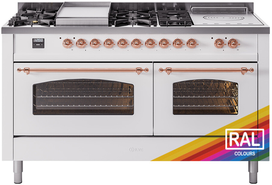 Freestanding Dual Fuel Range with 7 Sealed Burners, 5.8 cu. ft. Total Capacity, Storage Drawer, Griddle, and French Top: RAL Color, Copper Trim, Triple Glass Door. Enjoy the flexibility of seven sealed burners, offering a variety of heat settings to meet all your cooking needs. With 5.8 cubic feet of total oven capacity, you can effortlessly prepare large meals and multiple dishes at once. Keep your kitchen essentials organized and within easy reach with the convenient storage drawer. Cook up delicious breakfasts and more on the built-in griddle, perfect for pancakes, eggs, and grilled sandwiches. Achieve exceptional cooking precision with the French top, ideal for simmering and maintaining gentle heat. With power up to 25000 btu as standard. Optimal supply and perfect distribution of the heat, for all types of cooking. With non-stick nanotechnological treatment. The noble technical characteristics of brass are enriched with a nanotechnological coating that assures easy cleaning, with an elegant Total Black finish. Structure in AISI 304 steel with 12/10 thickness, option to choose the ideal combination between a gas hob with up to 9 burners or induction, mixed and in various setups. The indestructible cast iron pan supports provide a functional and safe support for the pots. The electronic control ensures that the temperature of the oven remains constant throughout, without fluctuating, as is the case in conventional ovens. It can be set with precision starting from 85F, for perfect proofing, up to 575F, for roasting. The door hinges are fitted with a shock absorber that makes the closure more gradual and noiseless. The quick oven preheating function allows it to reach the desired temperature in a short time and you can then choose the best-suited cooking mode for the dish. It also works as rapid defrosting when a low temperature is set (85F 105F). The grease does not stick to the surface and can therefore be cleaned more easily. Pizza function. Quick start. Multiple fan cooking. Intensive cooking. Fan grill cooking. Grill cooking with closed-door. Cooking from above. Cooking from below. Static normal cooking. Pizza function. Quick start. Multiple fan cooking. Intensive cooking. Fan grill cooking. Grill cooking with closed-door. Cooking from above. Cooking from below. Static normal cooking. Series: Nostalgie II. Noblesse Frames: No. Fuel Type: Dual Fuel. Gas Type: Natural Gas. Installation Type: Freestanding. Oven Total Capacity (cu. ft.): 5.8. Sabbath Mode: No. Number of Racks: 2. Drawer Type: Storage Drawer. Display Type: LCD Display. Timer: Yes. Cooking Probe: Yes. Rotisserie: Yes. Soft Close Door: Yes. Cooktop Configuration: 7 Sealed Burners + Griddle + French Top. Burner/Element Type: Sealed Burner. Griddle: Yes. Grill: No. Oven Control Type: Knobs. Oven Door Type: Triple Glass Door. Number of Ovens: Double Oven. Main Oven Capacity (cu. ft.): 3.5. Second Oven Capacity (cu. ft.): 2.3. Oven Cleaning Type: Easy Clean Enamel Cavities. Main Oven Type: UOV 80 M. Second Oven Type: UOV 60 M. ADA Compliant: No. Star-K Certified: No. Voltage: 240 V. Amps: 30 A. Exterior Width: 60". Width: 59 1/2". Depth: 27". Height: 36 1/4" - 38 1/2".