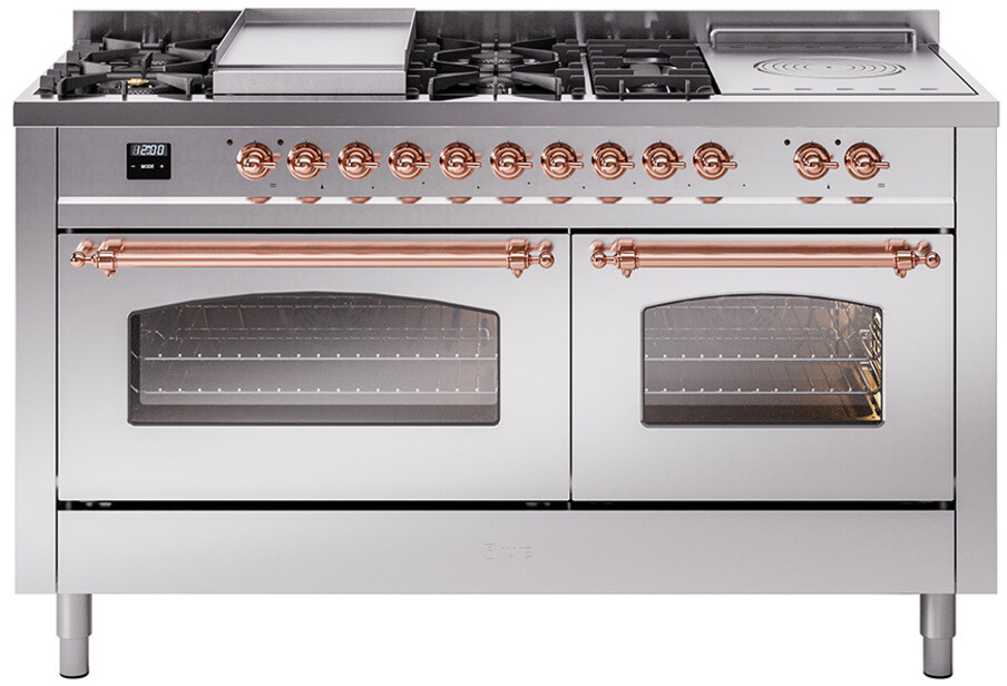 Freestanding Dual Fuel Range with 7 Sealed Burners, 5.8 cu. ft. Total Capacity, Storage Drawer, Griddle, and French Top: Stainless Steel, Copper Trim, Triple Glass Door. Enjoy the flexibility of seven sealed burners, offering a variety of heat settings to meet all your cooking needs. With 5.8 cubic feet of total oven capacity, you can effortlessly prepare large meals and multiple dishes at once. Keep your kitchen essentials organized and within easy reach with the convenient storage drawer. Cook up delicious breakfasts and more on the built-in griddle, perfect for pancakes, eggs, and grilled sandwiches. Achieve exceptional cooking precision with the French top, ideal for simmering and maintaining gentle heat. With power up to 25000 btu as standard. Optimal supply and perfect distribution of the heat, for all types of cooking. With non-stick nanotechnological treatment. The noble technical characteristics of brass are enriched with a nanotechnological coating that assures easy cleaning, with an elegant Total Black finish. Structure in AISI 304 steel with 12/10 thickness, option to choose the ideal combination between a gas hob with up to 9 burners or induction, mixed and in various setups. The indestructible cast iron pan supports provide a functional and safe support for the pots. The electronic control ensures that the temperature of the oven remains constant throughout, without fluctuating, as is the case in conventional ovens. It can be set with precision starting from 85F, for perfect proofing, up to 575F, for roasting. The door hinges are fitted with a shock absorber that makes the closure more gradual and noiseless. The quick oven preheating function allows it to reach the desired temperature in a short time and you can then choose the best-suited cooking mode for the dish. It also works as rapid defrosting when a low temperature is set (85F 105F). The grease does not stick to the surface and can therefore be cleaned more easily. Pizza function. Quick start. Multiple fan cooking. Intensive cooking. Fan grill cooking. Grill cooking with closed-door. Cooking from above. Cooking from below. Static normal cooking. Pizza function. Quick start. Multiple fan cooking. Intensive cooking. Fan grill cooking. Grill cooking with closed-door. Cooking from above. Cooking from below. Static normal cooking. Series: Nostalgie II. Noblesse Frames: No. Fuel Type: Dual Fuel. Gas Type: Natural Gas. Installation Type: Freestanding. Oven Total Capacity (cu. ft.): 5.8. Sabbath Mode: No. Number of Racks: 2. Drawer Type: Storage Drawer. Display Type: LCD Display. Timer: Yes. Cooking Probe: Yes. Rotisserie: Yes. Soft Close Door: Yes. Cooktop Configuration: 7 Sealed Burners + Griddle + French Top. Burner/Element Type: Sealed Burner. Griddle: Yes. Grill: No. Oven Control Type: Knobs. Oven Door Type: Triple Glass Door. Number of Ovens: Double Oven. Main Oven Capacity (cu. ft.): 3.5. Second Oven Capacity (cu. ft.): 2.3. Oven Cleaning Type: Easy Clean Enamel Cavities. Main Oven Type: UOV 80 M. Second Oven Type: UOV 60 M. ADA Compliant: No. Star-K Certified: No. Voltage: 240 V. Amps: 30 A. Exterior Width: 60". Width: 59 1/2". Depth: 27". Height: 36 1/4" - 38 1/2".