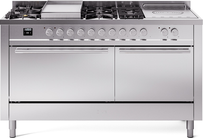 Freestanding Dual Fuel Range (Solid Door) with 7 Sealed Burners, Fry Top, Coup De Feu, Double Electric Ovens, 5.8 Cu. Ft. Total Oven Capacity, Convection Oven, Continuous Cast Iron Grates, Soft-Closing Door & Drawer, Quick Start, Cooling Ventilation, Storage Drawer, Simmer Burner and 25,000 BTU Dual Function Burner: Stainless Steel, NG. Customize your kitchen with a range of vibrant RAL color options to perfectly match your style. Experience precise cooking control with temperatures ranging from 100 to 500F, perfect for any culinary need. Reduce waiting time with our quick pre-heat feature, allowing you to start cooking faster. Ensure safety and efficiency with advanced cooling ventilation and high-density insulation, keeping external surfaces cool and heat well-contained. Enjoy the quiet and smooth operation of a soft-closing oven door. Stay safe with a cold door featuring triple glass for enhanced insulation and reduced external heat. Simplify maintenance with easy clean enamel that makes post-cooking clean-up a breeze. Cook with precision using highly specialized hobs designed for diverse culinary techniques. Achieve even cooking with brass flame spreaders coated with non-stick nanotechnology for easy cleaning and superior performance. Expand your cooking options with a robust 3/8" thick full-size fry top plate, ideal for grilling and searing. Enjoy powerful heat distribution with a triple crown burner for efficient and versatile cooking. Start cooking instantly with integrated ignition conveniently located in the knobs. Experience durability and stability with heavy cast iron pan supports that can handle heavy cookware. Cook with flexibility using multi-gas burners that are compatible with various gas types. Benefit from the efficiency of tilted flames that provide better heat distribution and cooking results. Maximize your cooking space and versatility with bridge control, allowing you to connect burners for larger cookware. The taste of tradition, with a modern twist. Cooking with love means improving the quality of life, an important promise that ILVE always keeps. Its collections address people's needs in a tangible, consistent and elegant way. From the appeal of classic styles to new design trends, ILVE designs appliances that decorate, paying the utmost attention to technology and details. For over 50 years ILVE has been a world class leader in cooking systems. They first introduced their oversized built-in oven in 1969, and only a few years later unveiled their revolutionary Panoramagic range cooker. In their half century of continued research and commitment, ILVE has designed and implemented solutions that have raised the levels of performance, safety and satisfaction in the kitchen-because cooking well means living well. ILVE ranges are inspired by the kitchens in which the great chefs work their wonders, but their aesthetics and efficiency suit the home. ILVE uses the same durable materials as professional kitchens: stainless steel (Aisi 304), cast iron, brass and copper. Like the selection of the raw materials, the technological features of every range component also undergo strict inspection. ILVE appliances are made individually, according to customer specifications, and are assembled by hand with expertise, passion and craftsmanship. The reliability of ILVE products and services has been proven for for over 50 years. Every ILVE appliance and range cooker is produced in line with the highest quality certifications, and manually assembled by skilled craftsmen who oversee even the smallest detail. This guarantees perfect operation for decades, as evidenced by the satisfaction of our many customers who demand functionality, safety and durability. Style: Freestanding. Cooktop: Sealed Burner. Drawer: Storage. Fuel Type: Dual Fuel. Continuous Grates: Yes. Digital Clock: Yes. Pro-Style: Yes. Exterior Width: 60". Width: 59.5". Height: 40.75". Depth: 26.5". Total Capacity: 5.8 cu. ft. Primary Oven Capacity: 3.5 cu. ft. Secondary Oven Capacity: 2.3 cu. ft. Cooking Modes: 9. Oven Temperature Range: 100 to 500 F. Dual Door: Yes. Steam-Clean: No. Broiler: Yes. Sabbath Mode: No. Self-Cleaning: No. Convection: Yes. Delay Bake: No. Digital Temperature Display: Yes. Oven Control Type: Digital. Steam Oven: No. Double Oven: Yes. Temperature Probe: No. Interior Oven Light: Yes. Burners: 9. Cooktop Control Type: Knobs. Downdraft Ventilation: No. Griddle: Yes. Grill: No. Cast Iron Grates: Yes. Fry Top: Yes. Coup De Feu Burner: Yes. Highest Burner Output: 25000 BTU. Left Front: 25000 BTU. Left Back: 10500 BTU. Griddle Front: 7000 BTU. Griddle Back: 10500 BTU. Middle Front: 7000 BTU. Middle Back: 10500 BTU. Oval Burner: 10500 BTU. Coupe de Feu Burner: 5500 BTU. Volts: 240 Volts. Amps: 30 Amps. ADA Compliant: No. Handle Shape: Rectangular. Handle Type: Bar. Cool Door with Triple Oven Glass: No, Solid Door. Total Black Nano-Tech Non Stick Coated Burners: Yes. Storage Drawer: Yes. Handcrafted from Italy: Yes.