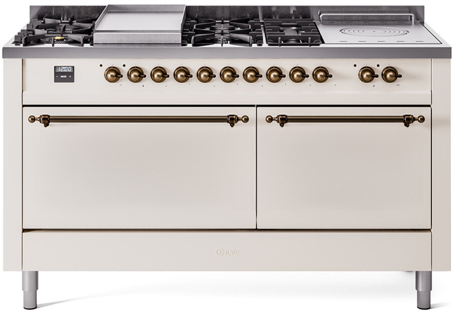 Freestanding Dual Fuel Range with 7 Sealed Burners, 5.8 cu. ft. Total Capacity, Storage Drawer, Griddle, and French Top: Antique White, Bronze Trim, Solid Door. Enjoy the flexibility of seven sealed burners, offering a variety of heat settings to meet all your cooking needs. With 5.8 cubic feet of total oven capacity, you can effortlessly prepare large meals and multiple dishes at once. Keep your kitchen essentials organized and within easy reach with the convenient storage drawer. Cook up delicious breakfasts and more on the built-in griddle, perfect for pancakes, eggs, and grilled sandwiches. Achieve exceptional cooking precision with the French top, ideal for simmering and maintaining gentle heat. With power up to 25000 btu as standard. Optimal supply and perfect distribution of the heat, for all types of cooking. With non-stick nanotechnological treatment. The noble technical characteristics of brass are enriched with a nanotechnological coating that assures easy cleaning, with an elegant Total Black finish. Structure in AISI 304 steel with 12/10 thickness, option to choose the ideal combination between a gas hob with up to 9 burners or induction, mixed and in various setups. The indestructible cast iron pan supports provide a functional and safe support for the pots. The electronic control ensures that the temperature of the oven remains constant throughout, without fluctuating, as is the case in conventional ovens. It can be set with precision starting from 85F, for perfect proofing, up to 575F, for roasting. The door hinges are fitted with a shock absorber that makes the closure more gradual and noiseless. The quick oven preheating function allows it to reach the desired temperature in a short time and you can then choose the best-suited cooking mode for the dish. It also works as rapid defrosting when a low temperature is set (85F 105F). The grease does not stick to the surface and can therefore be cleaned more easily. Pizza function. Quick start. Multiple fan cooking. Intensive cooking. Fan grill cooking. Grill cooking with closed-door. Cooking from above. Cooking from below. Static normal cooking. Pizza function. Quick start. Multiple fan cooking. Intensive cooking. Fan grill cooking. Grill cooking with closed-door. Cooking from above. Cooking from below. Static normal cooking. Series: Nostalgie II. Noblesse Frames: No. Fuel Type: Dual Fuel. Gas Type: Natural Gas. Installation Type: Freestanding. Oven Total Capacity (cu. ft.): 5.8. Sabbath Mode: No. Number of Racks: 2. Drawer Type: Storage Drawer. Display Type: LCD Display. Timer: Yes. Cooking Probe: Yes. Rotisserie: Yes. Soft Close Door: Yes. Cooktop Configuration: 7 Sealed Burners + Griddle + French Top. Burner/Element Type: Sealed Burner. Griddle: Yes. Grill: No. Oven Control Type: Knobs. Oven Door Type: Solid Door. Number of Ovens: Double Oven. Main Oven Capacity (cu. ft.): 3.5. Second Oven Capacity (cu. ft.): 2.3. Oven Cleaning Type: Easy Clean Enamel Cavities. Main Oven Type: UOV 80 M. Second Oven Type: UOV 60 M. ADA Compliant: No. Star-K Certified: No. Voltage: 240 V. Amps: 30 A. Exterior Width: 60". Width: 59 1/2". Depth: 27". Height: 36 1/4" - 38 1/2".