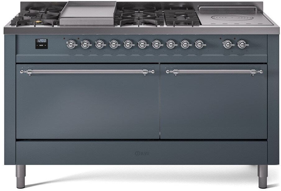Freestanding Dual Fuel Range with 7 Sealed Burners, 5.8 cu. ft. Total Capacity, Storage Drawer, Griddle, and French Top: Blue Grey, Chrome Trim, Solid Door. Enjoy the flexibility of seven sealed burners, offering a variety of heat settings to meet all your cooking needs. With 5.8 cubic feet of total oven capacity, you can effortlessly prepare large meals and multiple dishes at once. Keep your kitchen essentials organized and within easy reach with the convenient storage drawer. Cook up delicious breakfasts and more on the built-in griddle, perfect for pancakes, eggs, and grilled sandwiches. Achieve exceptional cooking precision with the French top, ideal for simmering and maintaining gentle heat. With power up to 25000 btu as standard. Optimal supply and perfect distribution of the heat, for all types of cooking. With non-stick nanotechnological treatment. The noble technical characteristics of brass are enriched with a nanotechnological coating that assures easy cleaning, with an elegant Total Black finish. Structure in AISI 304 steel with 12/10 thickness, option to choose the ideal combination between a gas hob with up to 9 burners or induction, mixed and in various setups. The indestructible cast iron pan supports provide a functional and safe support for the pots. The electronic control ensures that the temperature of the oven remains constant throughout, without fluctuating, as is the case in conventional ovens. It can be set with precision starting from 85F, for perfect proofing, up to 575F, for roasting. The door hinges are fitted with a shock absorber that makes the closure more gradual and noiseless. The quick oven preheating function allows it to reach the desired temperature in a short time and you can then choose the best-suited cooking mode for the dish. It also works as rapid defrosting when a low temperature is set (85F 105F). The grease does not stick to the surface and can therefore be cleaned more easily. Pizza function. Quick start. Multiple fan cooking. Intensive cooking. Fan grill cooking. Grill cooking with closed-door. Cooking from above. Cooking from below. Static normal cooking. Pizza function. Quick start. Multiple fan cooking. Intensive cooking. Fan grill cooking. Grill cooking with closed-door. Cooking from above. Cooking from below. Static normal cooking. Series: Nostalgie II. Noblesse Frames: No. Fuel Type: Dual Fuel. Gas Type: Natural Gas. Installation Type: Freestanding. Oven Total Capacity (cu. ft.): 5.8. Sabbath Mode: No. Number of Racks: 2. Drawer Type: Storage Drawer. Display Type: LCD Display. Timer: Yes. Cooking Probe: Yes. Rotisserie: Yes. Soft Close Door: Yes. Cooktop Configuration: 7 Sealed Burners + Griddle + French Top. Burner/Element Type: Sealed Burner. Griddle: Yes. Grill: No. Oven Control Type: Knobs. Oven Door Type: Solid Door. Number of Ovens: Double Oven. Main Oven Capacity (cu. ft.): 3.5. Second Oven Capacity (cu. ft.): 2.3. Oven Cleaning Type: Easy Clean Enamel Cavities. Main Oven Type: UOV 80 M. Second Oven Type: UOV 60 M. ADA Compliant: No. Star-K Certified: No. Voltage: 240 V. Amps: 30 A. Exterior Width: 60". Width: 59 1/2". Depth: 27". Height: 36 1/4" - 38 1/2".