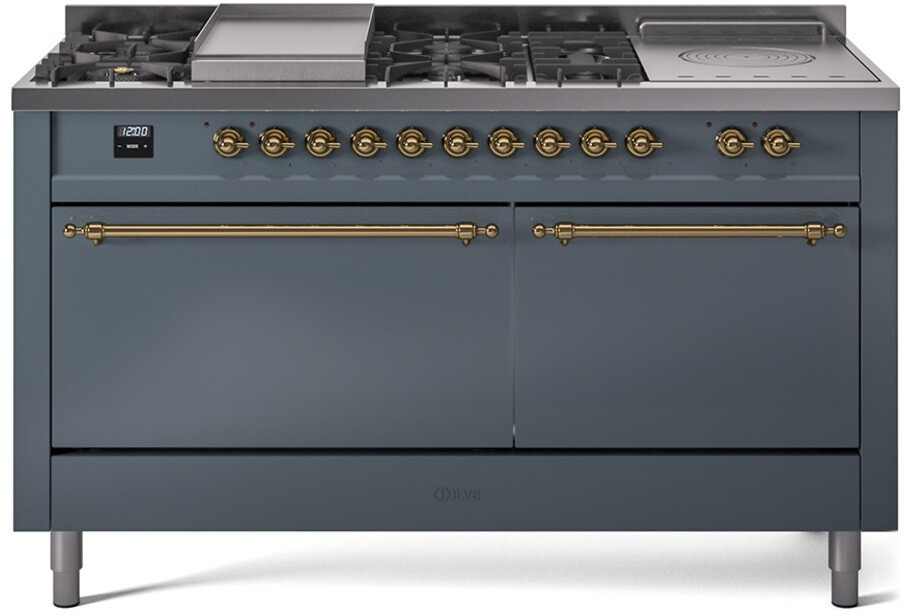 Freestanding Dual Fuel Range with 7 Sealed Burners, 5.8 cu. ft. Total Capacity, Storage Drawer, Griddle, and French Top: Blue Grey, Brass Trim, Solid Door. Enjoy the flexibility of seven sealed burners, offering a variety of heat settings to meet all your cooking needs. With 5.8 cubic feet of total oven capacity, you can effortlessly prepare large meals and multiple dishes at once. Keep your kitchen essentials organized and within easy reach with the convenient storage drawer. Cook up delicious breakfasts and more on the built-in griddle, perfect for pancakes, eggs, and grilled sandwiches. Achieve exceptional cooking precision with the French top, ideal for simmering and maintaining gentle heat. With power up to 25000 btu as standard. Optimal supply and perfect distribution of the heat, for all types of cooking. With non-stick nanotechnological treatment. The noble technical characteristics of brass are enriched with a nanotechnological coating that assures easy cleaning, with an elegant Total Black finish. Structure in AISI 304 steel with 12/10 thickness, option to choose the ideal combination between a gas hob with up to 9 burners or induction, mixed and in various setups. The indestructible cast iron pan supports provide a functional and safe support for the pots. The electronic control ensures that the temperature of the oven remains constant throughout, without fluctuating, as is the case in conventional ovens. It can be set with precision starting from 85F, for perfect proofing, up to 575F, for roasting. The door hinges are fitted with a shock absorber that makes the closure more gradual and noiseless. The quick oven preheating function allows it to reach the desired temperature in a short time and you can then choose the best-suited cooking mode for the dish. It also works as rapid defrosting when a low temperature is set (85F 105F). The grease does not stick to the surface and can therefore be cleaned more easily. Pizza function. Quick start. Multiple fan cooking. Intensive cooking. Fan grill cooking. Grill cooking with closed-door. Cooking from above. Cooking from below. Static normal cooking. Pizza function. Quick start. Multiple fan cooking. Intensive cooking. Fan grill cooking. Grill cooking with closed-door. Cooking from above. Cooking from below. Static normal cooking. Series: Nostalgie II. Noblesse Frames: No. Fuel Type: Dual Fuel. Gas Type: Natural Gas. Installation Type: Freestanding. Oven Total Capacity (cu. ft.): 5.8. Sabbath Mode: No. Number of Racks: 2. Drawer Type: Storage Drawer. Display Type: LCD Display. Timer: Yes. Cooking Probe: Yes. Rotisserie: Yes. Soft Close Door: Yes. Cooktop Configuration: 7 Sealed Burners + Griddle + French Top. Burner/Element Type: Sealed Burner. Griddle: Yes. Grill: No. Oven Control Type: Knobs. Oven Door Type: Solid Door. Number of Ovens: Double Oven. Main Oven Capacity (cu. ft.): 3.5. Second Oven Capacity (cu. ft.): 2.3. Oven Cleaning Type: Easy Clean Enamel Cavities. Main Oven Type: UOV 80 M. Second Oven Type: UOV 60 M. ADA Compliant: No. Star-K Certified: No. Voltage: 240 V. Amps: 30 A. Exterior Width: 60". Width: 59 1/2". Depth: 27". Height: 36 1/4" - 38 1/2".