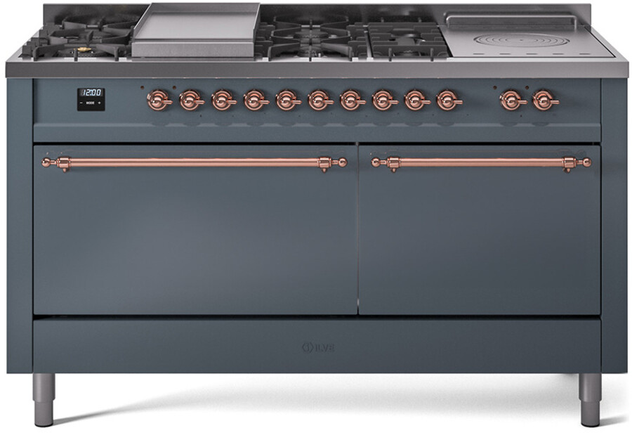 Freestanding Dual Fuel Range with 7 Sealed Burners, 5.8 cu. ft. Total Capacity, Storage Drawer, Griddle, and French Top: Blue Grey, Copper Trim, Solid Door. Enjoy the flexibility of seven sealed burners, offering a variety of heat settings to meet all your cooking needs. With 5.8 cubic feet of total oven capacity, you can effortlessly prepare large meals and multiple dishes at once. Keep your kitchen essentials organized and within easy reach with the convenient storage drawer. Cook up delicious breakfasts and more on the built-in griddle, perfect for pancakes, eggs, and grilled sandwiches. Achieve exceptional cooking precision with the French top, ideal for simmering and maintaining gentle heat. With power up to 25000 btu as standard. Optimal supply and perfect distribution of the heat, for all types of cooking. With non-stick nanotechnological treatment. The noble technical characteristics of brass are enriched with a nanotechnological coating that assures easy cleaning, with an elegant Total Black finish. Structure in AISI 304 steel with 12/10 thickness, option to choose the ideal combination between a gas hob with up to 9 burners or induction, mixed and in various setups. The indestructible cast iron pan supports provide a functional and safe support for the pots. The electronic control ensures that the temperature of the oven remains constant throughout, without fluctuating, as is the case in conventional ovens. It can be set with precision starting from 85F, for perfect proofing, up to 575F, for roasting. The door hinges are fitted with a shock absorber that makes the closure more gradual and noiseless. The quick oven preheating function allows it to reach the desired temperature in a short time and you can then choose the best-suited cooking mode for the dish. It also works as rapid defrosting when a low temperature is set (85F 105F). The grease does not stick to the surface and can therefore be cleaned more easily. Pizza function. Quick start. Multiple fan cooking. Intensive cooking. Fan grill cooking. Grill cooking with closed-door. Cooking from above. Cooking from below. Static normal cooking. Pizza function. Quick start. Multiple fan cooking. Intensive cooking. Fan grill cooking. Grill cooking with closed-door. Cooking from above. Cooking from below. Static normal cooking. Series: Nostalgie II. Noblesse Frames: No. Fuel Type: Dual Fuel. Gas Type: Natural Gas. Installation Type: Freestanding. Oven Total Capacity (cu. ft.): 5.8. Sabbath Mode: No. Number of Racks: 2. Drawer Type: Storage Drawer. Display Type: LCD Display. Timer: Yes. Cooking Probe: Yes. Rotisserie: Yes. Soft Close Door: Yes. Cooktop Configuration: 7 Sealed Burners + Griddle + French Top. Burner/Element Type: Sealed Burner. Griddle: Yes. Grill: No. Oven Control Type: Knobs. Oven Door Type: Solid Door. Number of Ovens: Double Oven. Main Oven Capacity (cu. ft.): 3.5. Second Oven Capacity (cu. ft.): 2.3. Oven Cleaning Type: Easy Clean Enamel Cavities. Main Oven Type: UOV 80 M. Second Oven Type: UOV 60 M. ADA Compliant: No. Star-K Certified: No. Voltage: 240 V. Amps: 30 A. Exterior Width: 60". Width: 59 1/2". Depth: 27". Height: 36 1/4" - 38 1/2".