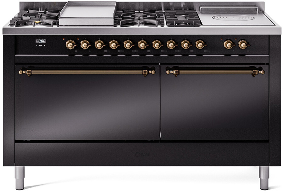 Freestanding Dual Fuel Range with 7 Sealed Burners, 5.8 cu. ft. Total Capacity, Storage Drawer, Griddle, and French Top: Glossy Black, Bronze Trim, Solid Door. Enjoy the flexibility of seven sealed burners, offering a variety of heat settings to meet all your cooking needs. With 5.8 cubic feet of total oven capacity, you can effortlessly prepare large meals and multiple dishes at once. Keep your kitchen essentials organized and within easy reach with the convenient storage drawer. Cook up delicious breakfasts and more on the built-in griddle, perfect for pancakes, eggs, and grilled sandwiches. Achieve exceptional cooking precision with the French top, ideal for simmering and maintaining gentle heat. With power up to 25000 btu as standard. Optimal supply and perfect distribution of the heat, for all types of cooking. With non-stick nanotechnological treatment. The noble technical characteristics of brass are enriched with a nanotechnological coating that assures easy cleaning, with an elegant Total Black finish. Structure in AISI 304 steel with 12/10 thickness, option to choose the ideal combination between a gas hob with up to 9 burners or induction, mixed and in various setups. The indestructible cast iron pan supports provide a functional and safe support for the pots. The electronic control ensures that the temperature of the oven remains constant throughout, without fluctuating, as is the case in conventional ovens. It can be set with precision starting from 85F, for perfect proofing, up to 575F, for roasting. The door hinges are fitted with a shock absorber that makes the closure more gradual and noiseless. The quick oven preheating function allows it to reach the desired temperature in a short time and you can then choose the best-suited cooking mode for the dish. It also works as rapid defrosting when a low temperature is set (85F 105F). The grease does not stick to the surface and can therefore be cleaned more easily. Pizza function. Quick start. Multiple fan cooking. Intensive cooking. Fan grill cooking. Grill cooking with closed-door. Cooking from above. Cooking from below. Static normal cooking. Pizza function. Quick start. Multiple fan cooking. Intensive cooking. Fan grill cooking. Grill cooking with closed-door. Cooking from above. Cooking from below. Static normal cooking. Series: Nostalgie II. Noblesse Frames: No. Fuel Type: Dual Fuel. Gas Type: Natural Gas. Installation Type: Freestanding. Oven Total Capacity (cu. ft.): 5.8. Sabbath Mode: No. Number of Racks: 2. Drawer Type: Storage Drawer. Display Type: LCD Display. Timer: Yes. Cooking Probe: Yes. Rotisserie: Yes. Soft Close Door: Yes. Cooktop Configuration: 7 Sealed Burners + Griddle + French Top. Burner/Element Type: Sealed Burner. Griddle: Yes. Grill: No. Oven Control Type: Knobs. Oven Door Type: Solid Door. Number of Ovens: Double Oven. Main Oven Capacity (cu. ft.): 3.5. Second Oven Capacity (cu. ft.): 2.3. Oven Cleaning Type: Easy Clean Enamel Cavities. Main Oven Type: UOV 80 M. Second Oven Type: UOV 60 M. ADA Compliant: No. Star-K Certified: No. Voltage: 240 V. Amps: 30 A. Exterior Width: 60". Width: 59 1/2". Depth: 27". Height: 36 1/4" - 38 1/2".