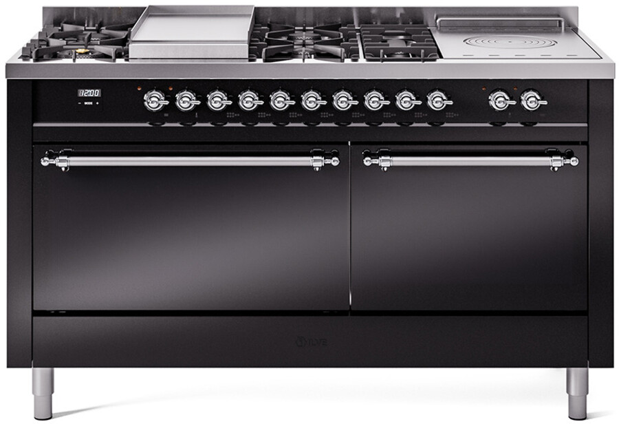 Freestanding Dual Fuel Range with 7 Sealed Burners, 5.8 cu. ft. Total Capacity, Storage Drawer, Griddle, and French Top: Glossy Black, Chrome Trim, Solid Door. Enjoy the flexibility of seven sealed burners, offering a variety of heat settings to meet all your cooking needs. With 5.8 cubic feet of total oven capacity, you can effortlessly prepare large meals and multiple dishes at once. Keep your kitchen essentials organized and within easy reach with the convenient storage drawer. Cook up delicious breakfasts and more on the built-in griddle, perfect for pancakes, eggs, and grilled sandwiches. Achieve exceptional cooking precision with the French top, ideal for simmering and maintaining gentle heat. With power up to 25000 btu as standard. Optimal supply and perfect distribution of the heat, for all types of cooking. With non-stick nanotechnological treatment. The noble technical characteristics of brass are enriched with a nanotechnological coating that assures easy cleaning, with an elegant Total Black finish. Structure in AISI 304 steel with 12/10 thickness, option to choose the ideal combination between a gas hob with up to 9 burners or induction, mixed and in various setups. The indestructible cast iron pan supports provide a functional and safe support for the pots. The electronic control ensures that the temperature of the oven remains constant throughout, without fluctuating, as is the case in conventional ovens. It can be set with precision starting from 85F, for perfect proofing, up to 575F, for roasting. The door hinges are fitted with a shock absorber that makes the closure more gradual and noiseless. The quick oven preheating function allows it to reach the desired temperature in a short time and you can then choose the best-suited cooking mode for the dish. It also works as rapid defrosting when a low temperature is set (85F 105F). The grease does not stick to the surface and can therefore be cleaned more easily. Pizza function. Quick start. Multiple fan cooking. Intensive cooking. Fan grill cooking. Grill cooking with closed-door. Cooking from above. Cooking from below. Static normal cooking. Pizza function. Quick start. Multiple fan cooking. Intensive cooking. Fan grill cooking. Grill cooking with closed-door. Cooking from above. Cooking from below. Static normal cooking. Series: Nostalgie II. Noblesse Frames: No. Fuel Type: Dual Fuel. Gas Type: Natural Gas. Installation Type: Freestanding. Oven Total Capacity (cu. ft.): 5.8. Sabbath Mode: No. Number of Racks: 2. Drawer Type: Storage Drawer. Display Type: LCD Display. Timer: Yes. Cooking Probe: Yes. Rotisserie: Yes. Soft Close Door: Yes. Cooktop Configuration: 7 Sealed Burners + Griddle + French Top. Burner/Element Type: Sealed Burner. Griddle: Yes. Grill: No. Oven Control Type: Knobs. Oven Door Type: Solid Door. Number of Ovens: Double Oven. Main Oven Capacity (cu. ft.): 3.5. Second Oven Capacity (cu. ft.): 2.3. Oven Cleaning Type: Easy Clean Enamel Cavities. Main Oven Type: UOV 80 M. Second Oven Type: UOV 60 M. ADA Compliant: No. Star-K Certified: No. Voltage: 240 V. Amps: 30 A. Exterior Width: 60". Width: 59 1/2". Depth: 27". Height: 36 1/4" - 38 1/2".