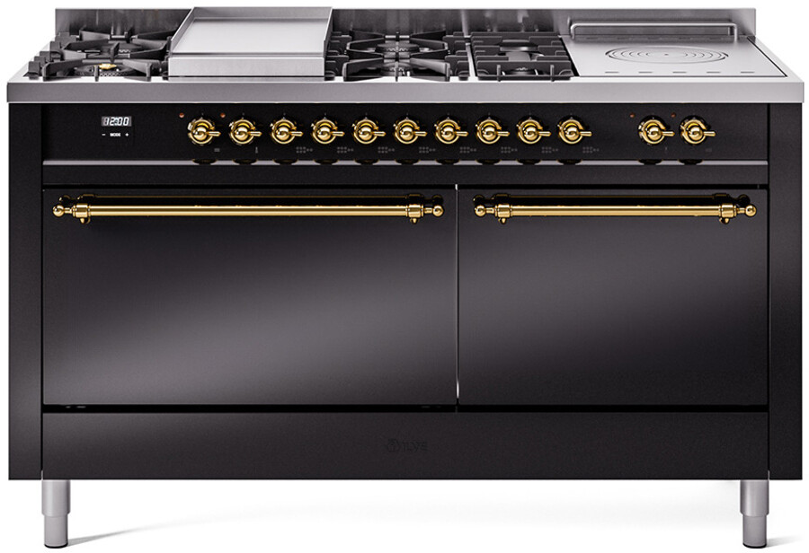 Freestanding Dual Fuel Range with 7 Sealed Burners, 5.8 cu. ft. Total Capacity, Storage Drawer, Griddle, and French Top: Glossy Black, Brass Trim, Solid Door. Enjoy the flexibility of seven sealed burners, offering a variety of heat settings to meet all your cooking needs. With 5.8 cubic feet of total oven capacity, you can effortlessly prepare large meals and multiple dishes at once. Keep your kitchen essentials organized and within easy reach with the convenient storage drawer. Cook up delicious breakfasts and more on the built-in griddle, perfect for pancakes, eggs, and grilled sandwiches. Achieve exceptional cooking precision with the French top, ideal for simmering and maintaining gentle heat. With power up to 25000 btu as standard. Optimal supply and perfect distribution of the heat, for all types of cooking. With non-stick nanotechnological treatment. The noble technical characteristics of brass are enriched with a nanotechnological coating that assures easy cleaning, with an elegant Total Black finish. Structure in AISI 304 steel with 12/10 thickness, option to choose the ideal combination between a gas hob with up to 9 burners or induction, mixed and in various setups. The indestructible cast iron pan supports provide a functional and safe support for the pots. The electronic control ensures that the temperature of the oven remains constant throughout, without fluctuating, as is the case in conventional ovens. It can be set with precision starting from 85F, for perfect proofing, up to 575F, for roasting. The door hinges are fitted with a shock absorber that makes the closure more gradual and noiseless. The quick oven preheating function allows it to reach the desired temperature in a short time and you can then choose the best-suited cooking mode for the dish. It also works as rapid defrosting when a low temperature is set (85F 105F). The grease does not stick to the surface and can therefore be cleaned more easily. Pizza function. Quick start. Multiple fan cooking. Intensive cooking. Fan grill cooking. Grill cooking with closed-door. Cooking from above. Cooking from below. Static normal cooking. Pizza function. Quick start. Multiple fan cooking. Intensive cooking. Fan grill cooking. Grill cooking with closed-door. Cooking from above. Cooking from below. Static normal cooking. Series: Nostalgie II. Noblesse Frames: No. Fuel Type: Dual Fuel. Gas Type: Natural Gas. Installation Type: Freestanding. Oven Total Capacity (cu. ft.): 5.8. Sabbath Mode: No. Number of Racks: 2. Drawer Type: Storage Drawer. Display Type: LCD Display. Timer: Yes. Cooking Probe: Yes. Rotisserie: Yes. Soft Close Door: Yes. Cooktop Configuration: 7 Sealed Burners + Griddle + French Top. Burner/Element Type: Sealed Burner. Griddle: Yes. Grill: No. Oven Control Type: Knobs. Oven Door Type: Solid Door. Number of Ovens: Double Oven. Main Oven Capacity (cu. ft.): 3.5. Second Oven Capacity (cu. ft.): 2.3. Oven Cleaning Type: Easy Clean Enamel Cavities. Main Oven Type: UOV 80 M. Second Oven Type: UOV 60 M. ADA Compliant: No. Star-K Certified: No. Voltage: 240 V. Amps: 30 A. Exterior Width: 60". Width: 59 1/2". Depth: 27". Height: 36 1/4" - 38 1/2".