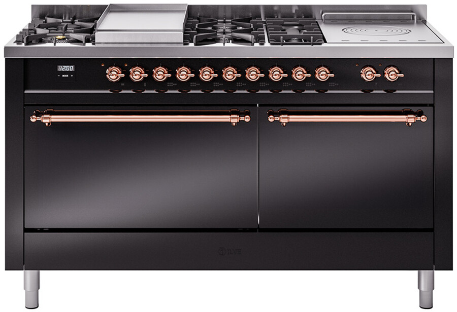 Freestanding Dual Fuel Range with 7 Sealed Burners, 5.8 cu. ft. Total Capacity, Storage Drawer, Griddle, and French Top: Glossy Black, Copper Trim, Solid Door. Enjoy the flexibility of seven sealed burners, offering a variety of heat settings to meet all your cooking needs. With 5.8 cubic feet of total oven capacity, you can effortlessly prepare large meals and multiple dishes at once. Keep your kitchen essentials organized and within easy reach with the convenient storage drawer. Cook up delicious breakfasts and more on the built-in griddle, perfect for pancakes, eggs, and grilled sandwiches. Achieve exceptional cooking precision with the French top, ideal for simmering and maintaining gentle heat. With power up to 25000 btu as standard. Optimal supply and perfect distribution of the heat, for all types of cooking. With non-stick nanotechnological treatment. The noble technical characteristics of brass are enriched with a nanotechnological coating that assures easy cleaning, with an elegant Total Black finish. Structure in AISI 304 steel with 12/10 thickness, option to choose the ideal combination between a gas hob with up to 9 burners or induction, mixed and in various setups. The indestructible cast iron pan supports provide a functional and safe support for the pots. The electronic control ensures that the temperature of the oven remains constant throughout, without fluctuating, as is the case in conventional ovens. It can be set with precision starting from 85F, for perfect proofing, up to 575F, for roasting. The door hinges are fitted with a shock absorber that makes the closure more gradual and noiseless. The quick oven preheating function allows it to reach the desired temperature in a short time and you can then choose the best-suited cooking mode for the dish. It also works as rapid defrosting when a low temperature is set (85F 105F). The grease does not stick to the surface and can therefore be cleaned more easily. Pizza function. Quick start. Multiple fan cooking. Intensive cooking. Fan grill cooking. Grill cooking with closed-door. Cooking from above. Cooking from below. Static normal cooking. Pizza function. Quick start. Multiple fan cooking. Intensive cooking. Fan grill cooking. Grill cooking with closed-door. Cooking from above. Cooking from below. Static normal cooking. Series: Nostalgie II. Noblesse Frames: No. Fuel Type: Dual Fuel. Gas Type: Natural Gas. Installation Type: Freestanding. Oven Total Capacity (cu. ft.): 5.8. Sabbath Mode: No. Number of Racks: 2. Drawer Type: Storage Drawer. Display Type: LCD Display. Timer: Yes. Cooking Probe: Yes. Rotisserie: Yes. Soft Close Door: Yes. Cooktop Configuration: 7 Sealed Burners + Griddle + French Top. Burner/Element Type: Sealed Burner. Griddle: Yes. Grill: No. Oven Control Type: Knobs. Oven Door Type: Solid Door. Number of Ovens: Double Oven. Main Oven Capacity (cu. ft.): 3.5. Second Oven Capacity (cu. ft.): 2.3. Oven Cleaning Type: Easy Clean Enamel Cavities. Main Oven Type: UOV 80 M. Second Oven Type: UOV 60 M. ADA Compliant: No. Star-K Certified: No. Voltage: 240 V. Amps: 30 A. Exterior Width: 60". Width: 59 1/2". Depth: 27". Height: 36 1/4" - 38 1/2".