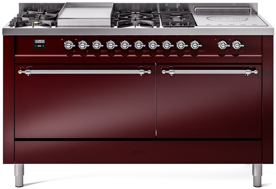 Freestanding Dual Fuel Range with 7 Sealed Burners, 5.8 cu. ft. Total Capacity, Storage Drawer, Griddle, and French Top: Burgundy, Chrome Trim, Solid Door. Enjoy the flexibility of seven sealed burners, offering a variety of heat settings to meet all your cooking needs. With 5.8 cubic feet of total oven capacity, you can effortlessly prepare large meals and multiple dishes at once. Keep your kitchen essentials organized and within easy reach with the convenient storage drawer. Cook up delicious breakfasts and more on the built-in griddle, perfect for pancakes, eggs, and grilled sandwiches. Achieve exceptional cooking precision with the French top, ideal for simmering and maintaining gentle heat. With power up to 25000 btu as standard. Optimal supply and perfect distribution of the heat, for all types of cooking. With non-stick nanotechnological treatment. The noble technical characteristics of brass are enriched with a nanotechnological coating that assures easy cleaning, with an elegant Total Black finish. Structure in AISI 304 steel with 12/10 thickness, option to choose the ideal combination between a gas hob with up to 9 burners or induction, mixed and in various setups. The indestructible cast iron pan supports provide a functional and safe support for the pots. The electronic control ensures that the temperature of the oven remains constant throughout, without fluctuating, as is the case in conventional ovens. It can be set with precision starting from 85F, for perfect proofing, up to 575F, for roasting. The door hinges are fitted with a shock absorber that makes the closure more gradual and noiseless. The quick oven preheating function allows it to reach the desired temperature in a short time and you can then choose the best-suited cooking mode for the dish. It also works as rapid defrosting when a low temperature is set (85F 105F). The grease does not stick to the surface and can therefore be cleaned more easily. Pizza function. Quick start. Multiple fan cooking. Intensive cooking. Fan grill cooking. Grill cooking with closed-door. Cooking from above. Cooking from below. Static normal cooking. Pizza function. Quick start. Multiple fan cooking. Intensive cooking. Fan grill cooking. Grill cooking with closed-door. Cooking from above. Cooking from below. Static normal cooking. Series: Nostalgie II. Noblesse Frames: No. Fuel Type: Dual Fuel. Gas Type: Natural Gas. Installation Type: Freestanding. Oven Total Capacity (cu. ft.): 5.8. Sabbath Mode: No. Number of Racks: 2. Drawer Type: Storage Drawer. Display Type: LCD Display. Timer: Yes. Cooking Probe: Yes. Rotisserie: Yes. Soft Close Door: Yes. Cooktop Configuration: 7 Sealed Burners + Griddle + French Top. Burner/Element Type: Sealed Burner. Griddle: Yes. Grill: No. Oven Control Type: Knobs. Oven Door Type: Solid Door. Number of Ovens: Double Oven. Main Oven Capacity (cu. ft.): 3.5. Second Oven Capacity (cu. ft.): 2.3. Oven Cleaning Type: Easy Clean Enamel Cavities. Main Oven Type: UOV 80 M. Second Oven Type: UOV 60 M. ADA Compliant: No. Star-K Certified: No. Voltage: 240 V. Amps: 30 A. Exterior Width: 60". Width: 59 1/2". Depth: 27". Height: 36 1/4" - 38 1/2".