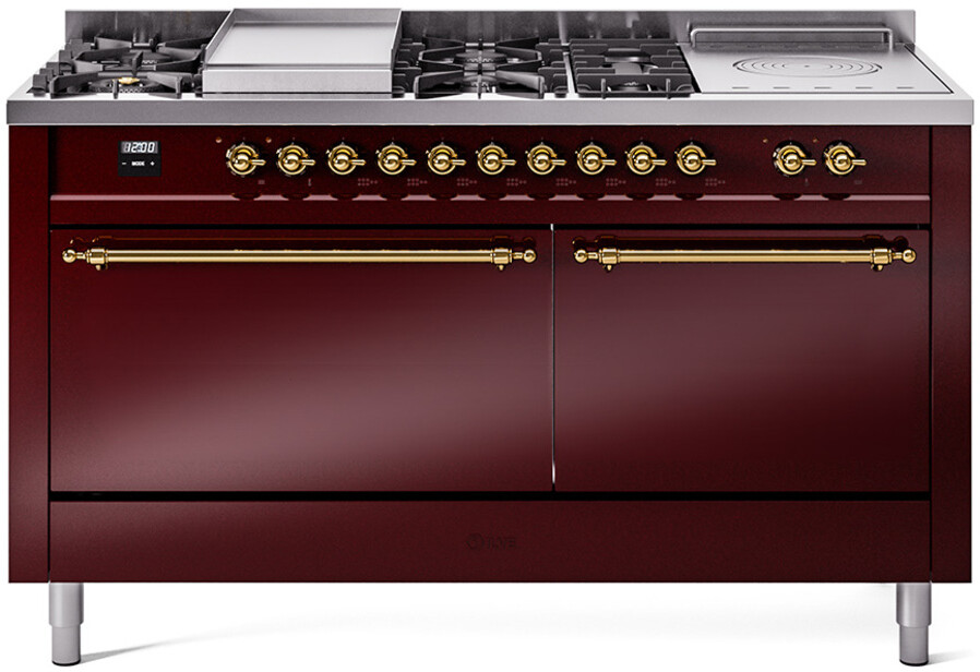Freestanding Dual Fuel Range with 7 Sealed Burners, 5.8 cu. ft. Total Capacity, Storage Drawer, Griddle, and French Top: Burgundy, Brass Trim, Solid Door. Enjoy the flexibility of seven sealed burners, offering a variety of heat settings to meet all your cooking needs. With 5.8 cubic feet of total oven capacity, you can effortlessly prepare large meals and multiple dishes at once. Keep your kitchen essentials organized and within easy reach with the convenient storage drawer. Cook up delicious breakfasts and more on the built-in griddle, perfect for pancakes, eggs, and grilled sandwiches. Achieve exceptional cooking precision with the French top, ideal for simmering and maintaining gentle heat. With power up to 25000 btu as standard. Optimal supply and perfect distribution of the heat, for all types of cooking. With non-stick nanotechnological treatment. The noble technical characteristics of brass are enriched with a nanotechnological coating that assures easy cleaning, with an elegant Total Black finish. Structure in AISI 304 steel with 12/10 thickness, option to choose the ideal combination between a gas hob with up to 9 burners or induction, mixed and in various setups. The indestructible cast iron pan supports provide a functional and safe support for the pots. The electronic control ensures that the temperature of the oven remains constant throughout, without fluctuating, as is the case in conventional ovens. It can be set with precision starting from 85F, for perfect proofing, up to 575F, for roasting. The door hinges are fitted with a shock absorber that makes the closure more gradual and noiseless. The quick oven preheating function allows it to reach the desired temperature in a short time and you can then choose the best-suited cooking mode for the dish. It also works as rapid defrosting when a low temperature is set (85F 105F). The grease does not stick to the surface and can therefore be cleaned more easily. Pizza function. Quick start. Multiple fan cooking. Intensive cooking. Fan grill cooking. Grill cooking with closed-door. Cooking from above. Cooking from below. Static normal cooking. Pizza function. Quick start. Multiple fan cooking. Intensive cooking. Fan grill cooking. Grill cooking with closed-door. Cooking from above. Cooking from below. Static normal cooking. Series: Nostalgie II. Noblesse Frames: No. Fuel Type: Dual Fuel. Gas Type: Natural Gas. Installation Type: Freestanding. Oven Total Capacity (cu. ft.): 5.8. Sabbath Mode: No. Number of Racks: 2. Drawer Type: Storage Drawer. Display Type: LCD Display. Timer: Yes. Cooking Probe: Yes. Rotisserie: Yes. Soft Close Door: Yes. Cooktop Configuration: 7 Sealed Burners + Griddle + French Top. Burner/Element Type: Sealed Burner. Griddle: Yes. Grill: No. Oven Control Type: Knobs. Oven Door Type: Solid Door. Number of Ovens: Double Oven. Main Oven Capacity (cu. ft.): 3.5. Second Oven Capacity (cu. ft.): 2.3. Oven Cleaning Type: Easy Clean Enamel Cavities. Main Oven Type: UOV 80 M. Second Oven Type: UOV 60 M. ADA Compliant: No. Star-K Certified: No. Voltage: 240 V. Amps: 30 A. Exterior Width: 60". Width: 59 1/2". Depth: 27". Height: 36 1/4" - 38 1/2".