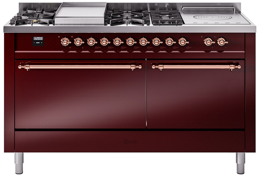 Freestanding Dual Fuel Range with 7 Sealed Burners, 5.8 cu. ft. Total Capacity, Storage Drawer, Griddle, and French Top: Burgundy, Copper Trim, Solid Door. Enjoy the flexibility of seven sealed burners, offering a variety of heat settings to meet all your cooking needs. With 5.8 cubic feet of total oven capacity, you can effortlessly prepare large meals and multiple dishes at once. Keep your kitchen essentials organized and within easy reach with the convenient storage drawer. Cook up delicious breakfasts and more on the built-in griddle, perfect for pancakes, eggs, and grilled sandwiches. Achieve exceptional cooking precision with the French top, ideal for simmering and maintaining gentle heat. With power up to 25000 btu as standard. Optimal supply and perfect distribution of the heat, for all types of cooking. With non-stick nanotechnological treatment. The noble technical characteristics of brass are enriched with a nanotechnological coating that assures easy cleaning, with an elegant Total Black finish. Structure in AISI 304 steel with 12/10 thickness, option to choose the ideal combination between a gas hob with up to 9 burners or induction, mixed and in various setups. The indestructible cast iron pan supports provide a functional and safe support for the pots. The electronic control ensures that the temperature of the oven remains constant throughout, without fluctuating, as is the case in conventional ovens. It can be set with precision starting from 85F, for perfect proofing, up to 575F, for roasting. The door hinges are fitted with a shock absorber that makes the closure more gradual and noiseless. The quick oven preheating function allows it to reach the desired temperature in a short time and you can then choose the best-suited cooking mode for the dish. It also works as rapid defrosting when a low temperature is set (85F 105F). The grease does not stick to the surface and can therefore be cleaned more easily. Pizza function. Quick start. Multiple fan cooking. Intensive cooking. Fan grill cooking. Grill cooking with closed-door. Cooking from above. Cooking from below. Static normal cooking. Pizza function. Quick start. Multiple fan cooking. Intensive cooking. Fan grill cooking. Grill cooking with closed-door. Cooking from above. Cooking from below. Static normal cooking. Series: Nostalgie II. Noblesse Frames: No. Fuel Type: Dual Fuel. Gas Type: Natural Gas. Installation Type: Freestanding. Oven Total Capacity (cu. ft.): 5.8. Sabbath Mode: No. Number of Racks: 2. Drawer Type: Storage Drawer. Display Type: LCD Display. Timer: Yes. Cooking Probe: Yes. Rotisserie: Yes. Soft Close Door: Yes. Cooktop Configuration: 7 Sealed Burners + Griddle + French Top. Burner/Element Type: Sealed Burner. Griddle: Yes. Grill: No. Oven Control Type: Knobs. Oven Door Type: Solid Door. Number of Ovens: Double Oven. Main Oven Capacity (cu. ft.): 3.5. Second Oven Capacity (cu. ft.): 2.3. Oven Cleaning Type: Easy Clean Enamel Cavities. Main Oven Type: UOV 80 M. Second Oven Type: UOV 60 M. ADA Compliant: No. Star-K Certified: No. Voltage: 240 V. Amps: 30 A. Exterior Width: 60". Width: 59 1/2". Depth: 27". Height: 36 1/4" - 38 1/2".