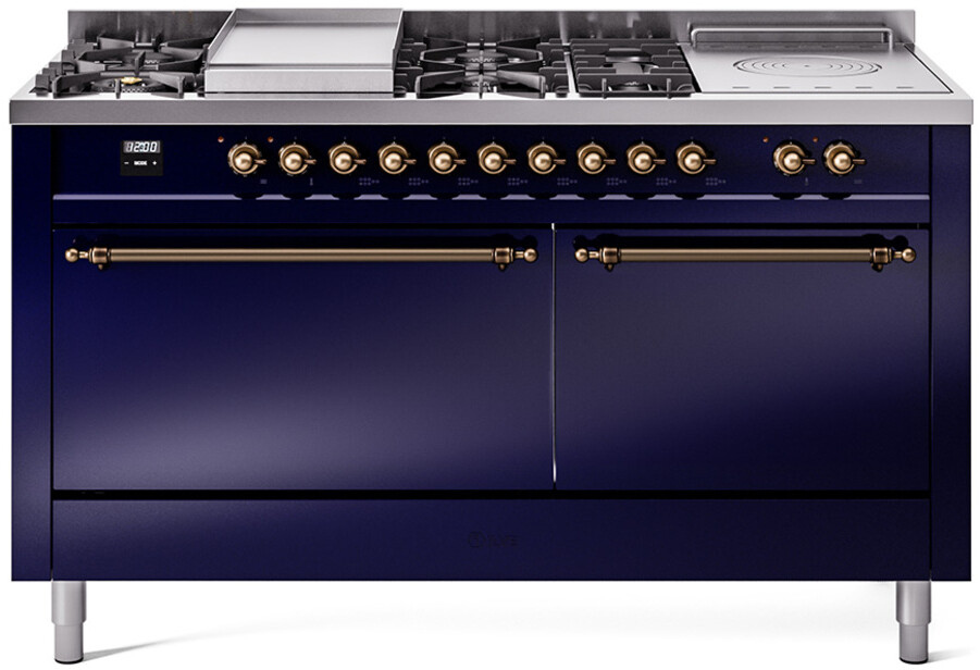 Freestanding Dual Fuel Range with 7 Sealed Burners, 5.8 cu. ft. Total Capacity, Storage Drawer, Griddle, and French Top: Midnight Blue, Bronze Trim, Solid Door. Enjoy the flexibility of seven sealed burners, offering a variety of heat settings to meet all your cooking needs. With 5.8 cubic feet of total oven capacity, you can effortlessly prepare large meals and multiple dishes at once. Keep your kitchen essentials organized and within easy reach with the convenient storage drawer. Cook up delicious breakfasts and more on the built-in griddle, perfect for pancakes, eggs, and grilled sandwiches. Achieve exceptional cooking precision with the French top, ideal for simmering and maintaining gentle heat. With power up to 25000 btu as standard. Optimal supply and perfect distribution of the heat, for all types of cooking. With non-stick nanotechnological treatment. The noble technical characteristics of brass are enriched with a nanotechnological coating that assures easy cleaning, with an elegant Total Black finish. Structure in AISI 304 steel with 12/10 thickness, option to choose the ideal combination between a gas hob with up to 9 burners or induction, mixed and in various setups. The indestructible cast iron pan supports provide a functional and safe support for the pots. The electronic control ensures that the temperature of the oven remains constant throughout, without fluctuating, as is the case in conventional ovens. It can be set with precision starting from 85F, for perfect proofing, up to 575F, for roasting. The door hinges are fitted with a shock absorber that makes the closure more gradual and noiseless. The quick oven preheating function allows it to reach the desired temperature in a short time and you can then choose the best-suited cooking mode for the dish. It also works as rapid defrosting when a low temperature is set (85F 105F). The grease does not stick to the surface and can therefore be cleaned more easily. Pizza function. Quick start. Multiple fan cooking. Intensive cooking. Fan grill cooking. Grill cooking with closed-door. Cooking from above. Cooking from below. Static normal cooking. Pizza function. Quick start. Multiple fan cooking. Intensive cooking. Fan grill cooking. Grill cooking with closed-door. Cooking from above. Cooking from below. Static normal cooking. Series: Nostalgie II. Noblesse Frames: No. Fuel Type: Dual Fuel. Gas Type: Natural Gas. Installation Type: Freestanding. Oven Total Capacity (cu. ft.): 5.8. Sabbath Mode: No. Number of Racks: 2. Drawer Type: Storage Drawer. Display Type: LCD Display. Timer: Yes. Cooking Probe: Yes. Rotisserie: Yes. Soft Close Door: Yes. Cooktop Configuration: 7 Sealed Burners + Griddle + French Top. Burner/Element Type: Sealed Burner. Griddle: Yes. Grill: No. Oven Control Type: Knobs. Oven Door Type: Solid Door. Number of Ovens: Double Oven. Main Oven Capacity (cu. ft.): 3.5. Second Oven Capacity (cu. ft.): 2.3. Oven Cleaning Type: Easy Clean Enamel Cavities. Main Oven Type: UOV 80 M. Second Oven Type: UOV 60 M. ADA Compliant: No. Star-K Certified: No. Voltage: 240 V. Amps: 30 A. Exterior Width: 60". Width: 59 1/2". Depth: 27". Height: 36 1/4" - 38 1/2".
