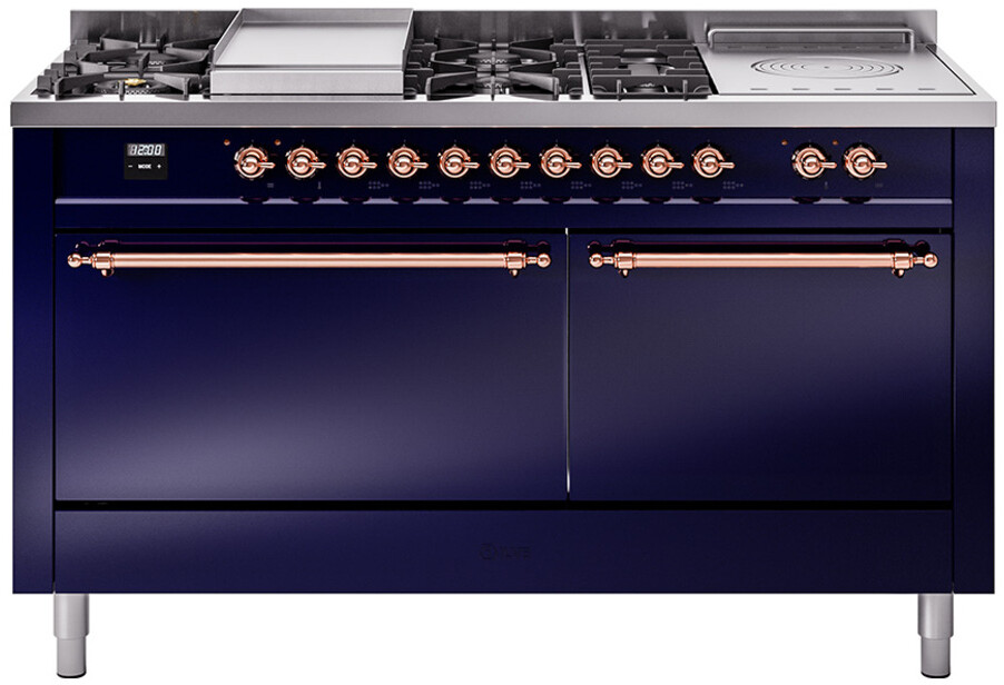 Freestanding Dual Fuel Range with 7 Sealed Burners, 5.8 cu. ft. Total Capacity, Storage Drawer, Griddle, and French Top: Midnight Blue, Copper Trim, Solid Door. Enjoy the flexibility of seven sealed burners, offering a variety of heat settings to meet all your cooking needs. With 5.8 cubic feet of total oven capacity, you can effortlessly prepare large meals and multiple dishes at once. Keep your kitchen essentials organized and within easy reach with the convenient storage drawer. Cook up delicious breakfasts and more on the built-in griddle, perfect for pancakes, eggs, and grilled sandwiches. Achieve exceptional cooking precision with the French top, ideal for simmering and maintaining gentle heat. With power up to 25000 btu as standard. Optimal supply and perfect distribution of the heat, for all types of cooking. With non-stick nanotechnological treatment. The noble technical characteristics of brass are enriched with a nanotechnological coating that assures easy cleaning, with an elegant Total Black finish. Structure in AISI 304 steel with 12/10 thickness, option to choose the ideal combination between a gas hob with up to 9 burners or induction, mixed and in various setups. The indestructible cast iron pan supports provide a functional and safe support for the pots. The electronic control ensures that the temperature of the oven remains constant throughout, without fluctuating, as is the case in conventional ovens. It can be set with precision starting from 85F, for perfect proofing, up to 575F, for roasting. The door hinges are fitted with a shock absorber that makes the closure more gradual and noiseless. The quick oven preheating function allows it to reach the desired temperature in a short time and you can then choose the best-suited cooking mode for the dish. It also works as rapid defrosting when a low temperature is set (85F 105F). The grease does not stick to the surface and can therefore be cleaned more easily. Pizza function. Quick start. Multiple fan cooking. Intensive cooking. Fan grill cooking. Grill cooking with closed-door. Cooking from above. Cooking from below. Static normal cooking. Pizza function. Quick start. Multiple fan cooking. Intensive cooking. Fan grill cooking. Grill cooking with closed-door. Cooking from above. Cooking from below. Static normal cooking. Series: Nostalgie II. Noblesse Frames: No. Fuel Type: Dual Fuel. Gas Type: Natural Gas. Installation Type: Freestanding. Oven Total Capacity (cu. ft.): 5.8. Sabbath Mode: No. Number of Racks: 2. Drawer Type: Storage Drawer. Display Type: LCD Display. Timer: Yes. Cooking Probe: Yes. Rotisserie: Yes. Soft Close Door: Yes. Cooktop Configuration: 7 Sealed Burners + Griddle + French Top. Burner/Element Type: Sealed Burner. Griddle: Yes. Grill: No. Oven Control Type: Knobs. Oven Door Type: Solid Door. Number of Ovens: Double Oven. Main Oven Capacity (cu. ft.): 3.5. Second Oven Capacity (cu. ft.): 2.3. Oven Cleaning Type: Easy Clean Enamel Cavities. Main Oven Type: UOV 80 M. Second Oven Type: UOV 60 M. ADA Compliant: No. Star-K Certified: No. Voltage: 240 V. Amps: 30 A. Exterior Width: 60". Width: 59 1/2". Depth: 27". Height: 36 1/4" - 38 1/2".
