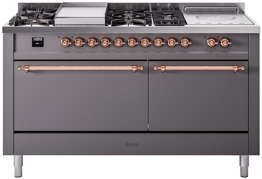 Freestanding Dual Fuel Range with 7 Sealed Burners, 5.8 cu. ft. Total Capacity, Storage Drawer, Griddle, and French Top: Graphite Matte, Copper Trim, Solid Door. Enjoy the flexibility of seven sealed burners, offering a variety of heat settings to meet all your cooking needs. With 5.8 cubic feet of total oven capacity, you can effortlessly prepare large meals and multiple dishes at once. Keep your kitchen essentials organized and within easy reach with the convenient storage drawer. Cook up delicious breakfasts and more on the built-in griddle, perfect for pancakes, eggs, and grilled sandwiches. Achieve exceptional cooking precision with the French top, ideal for simmering and maintaining gentle heat. With power up to 25000 btu as standard. Optimal supply and perfect distribution of the heat, for all types of cooking. With non-stick nanotechnological treatment. The noble technical characteristics of brass are enriched with a nanotechnological coating that assures easy cleaning, with an elegant Total Black finish. Structure in AISI 304 steel with 12/10 thickness, option to choose the ideal combination between a gas hob with up to 9 burners or induction, mixed and in various setups. The indestructible cast iron pan supports provide a functional and safe support for the pots. The electronic control ensures that the temperature of the oven remains constant throughout, without fluctuating, as is the case in conventional ovens. It can be set with precision starting from 85F, for perfect proofing, up to 575F, for roasting. The door hinges are fitted with a shock absorber that makes the closure more gradual and noiseless. The quick oven preheating function allows it to reach the desired temperature in a short time and you can then choose the best-suited cooking mode for the dish. It also works as rapid defrosting when a low temperature is set (85F 105F). The grease does not stick to the surface and can therefore be cleaned more easily. Pizza function. Quick start. Multiple fan cooking. Intensive cooking. Fan grill cooking. Grill cooking with closed-door. Cooking from above. Cooking from below. Static normal cooking. Pizza function. Quick start. Multiple fan cooking. Intensive cooking. Fan grill cooking. Grill cooking with closed-door. Cooking from above. Cooking from below. Static normal cooking. Series: Nostalgie II. Noblesse Frames: No. Fuel Type: Dual Fuel. Gas Type: Natural Gas. Installation Type: Freestanding. Oven Total Capacity (cu. ft.): 5.8. Sabbath Mode: No. Number of Racks: 2. Drawer Type: Storage Drawer. Display Type: LCD Display. Timer: Yes. Cooking Probe: Yes. Rotisserie: Yes. Soft Close Door: Yes. Cooktop Configuration: 7 Sealed Burners + Griddle + French Top. Burner/Element Type: Sealed Burner. Griddle: Yes. Grill: No. Oven Control Type: Knobs. Oven Door Type: Solid Door. Number of Ovens: Double Oven. Main Oven Capacity (cu. ft.): 3.5. Second Oven Capacity (cu. ft.): 2.3. Oven Cleaning Type: Easy Clean Enamel Cavities. Main Oven Type: UOV 80 M. Second Oven Type: UOV 60 M. ADA Compliant: No. Star-K Certified: No. Voltage: 240 V. Amps: 30 A. Exterior Width: 60". Width: 59 1/2". Depth: 27". Height: 36 1/4" - 38 1/2".