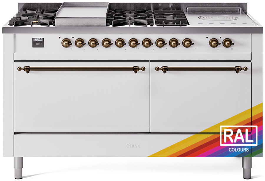 Freestanding Dual Fuel Range with 7 Sealed Burners, 5.8 cu. ft. Total Capacity, Storage Drawer, Griddle, and French Top: RAL Color, Bronze Trim, Solid Door. Enjoy the flexibility of seven sealed burners, offering a variety of heat settings to meet all your cooking needs. With 5.8 cubic feet of total oven capacity, you can effortlessly prepare large meals and multiple dishes at once. Keep your kitchen essentials organized and within easy reach with the convenient storage drawer. Cook up delicious breakfasts and more on the built-in griddle, perfect for pancakes, eggs, and grilled sandwiches. Achieve exceptional cooking precision with the French top, ideal for simmering and maintaining gentle heat. With power up to 25000 btu as standard. Optimal supply and perfect distribution of the heat, for all types of cooking. With non-stick nanotechnological treatment. The noble technical characteristics of brass are enriched with a nanotechnological coating that assures easy cleaning, with an elegant Total Black finish. Structure in AISI 304 steel with 12/10 thickness, option to choose the ideal combination between a gas hob with up to 9 burners or induction, mixed and in various setups. The indestructible cast iron pan supports provide a functional and safe support for the pots. The electronic control ensures that the temperature of the oven remains constant throughout, without fluctuating, as is the case in conventional ovens. It can be set with precision starting from 85F, for perfect proofing, up to 575F, for roasting. The door hinges are fitted with a shock absorber that makes the closure more gradual and noiseless. The quick oven preheating function allows it to reach the desired temperature in a short time and you can then choose the best-suited cooking mode for the dish. It also works as rapid defrosting when a low temperature is set (85F 105F). The grease does not stick to the surface and can therefore be cleaned more easily. Pizza function. Quick start. Multiple fan cooking. Intensive cooking. Fan grill cooking. Grill cooking with closed-door. Cooking from above. Cooking from below. Static normal cooking. Pizza function. Quick start. Multiple fan cooking. Intensive cooking. Fan grill cooking. Grill cooking with closed-door. Cooking from above. Cooking from below. Static normal cooking. Series: Nostalgie II. Noblesse Frames: No. Fuel Type: Dual Fuel. Gas Type: Natural Gas. Installation Type: Freestanding. Oven Total Capacity (cu. ft.): 5.8. Sabbath Mode: No. Number of Racks: 2. Drawer Type: Storage Drawer. Display Type: LCD Display. Timer: Yes. Cooking Probe: Yes. Rotisserie: Yes. Soft Close Door: Yes. Cooktop Configuration: 7 Sealed Burners + Griddle + French Top. Burner/Element Type: Sealed Burner. Griddle: Yes. Grill: No. Oven Control Type: Knobs. Oven Door Type: Solid Door. Number of Ovens: Double Oven. Main Oven Capacity (cu. ft.): 3.5. Second Oven Capacity (cu. ft.): 2.3. Oven Cleaning Type: Easy Clean Enamel Cavities. Main Oven Type: UOV 80 M. Second Oven Type: UOV 60 M. ADA Compliant: No. Star-K Certified: No. Voltage: 240 V. Amps: 30 A. Exterior Width: 60". Width: 59 1/2". Depth: 27". Height: 36 1/4" - 38 1/2".