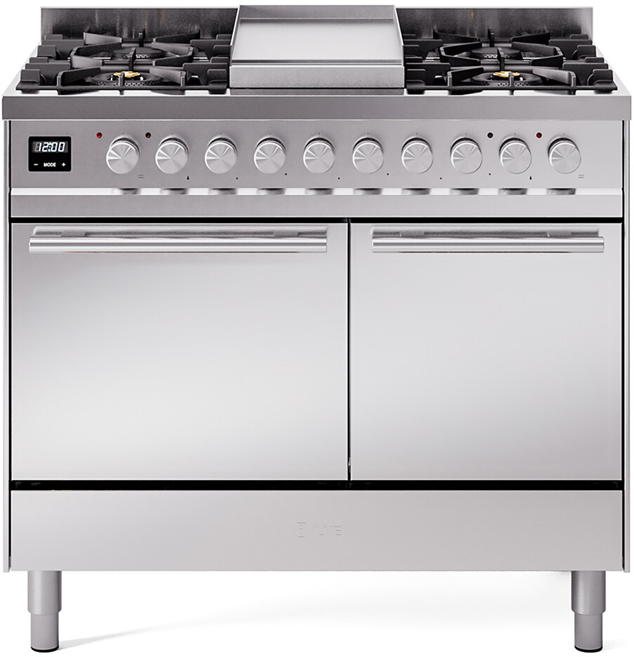 Freestanding Dual Fuel Range (Solid Oven Door) with 6 Sealed Burners, Double Oven, 4.3 Cu. Ft. Total Oven Capacity, Griddle, Continuous Cast Iron Grates, Soft-Closing Door & Drawer, Quick Start, Cooling Ventilation, Simmer Burner and 25,000 BTU Dual Function Burner: Stainless Steel, NG. Customize your kitchen with a range of vibrant RAL color options to perfectly match your style. Experience precise cooking control with temperatures ranging from 100 to 500F, perfect for any culinary need. Reduce waiting time with our quick pre-heat feature, allowing you to start cooking faster. Ensure safety and efficiency with advanced cooling ventilation and high-density insulation, keeping external surfaces cool and heat well-contained. Enjoy the quiet and smooth operation of a soft-closing oven door. Stay safe with a cold door featuring triple glass for enhanced insulation and reduced external heat. Simplify maintenance with easy clean enamel that makes post-cooking clean-up a breeze. Cook with precision using highly specialized hobs designed for diverse culinary techniques. Achieve even cooking with brass flame spreaders coated with non-stick nanotechnology for easy cleaning and superior performance. Expand your cooking options with a robust 3/8" thick full-size fry top plate, ideal for grilling and searing. Enjoy powerful heat distribution with a triple crown burner for efficient and versatile cooking. Start cooking instantly with integrated ignition conveniently located in the knobs. Experience durability and stability with heavy cast iron pan supports that can handle heavy cookware. Cook with flexibility using multi-gas burners that are compatible with various gas types. Benefit from the efficiency of tilted flames that provide better heat distribution and cooking results. Maximize your cooking space and versatility with bridge control, allowing you to connect burners for larger cookware. The taste of tradition, with a modern twist. Cooking with love means improving the quality of life, an important promise that ILVE always keeps. Its collections address people's needs in a tangible, consistent and elegant way. From the appeal of classic styles to new design trends, ILVE designs appliances that decorate, paying the utmost attention to technology and details. For over 50 years ILVE has been a world class leader in cooking systems. They first introduced their oversized built-in oven in 1969, and only a few years later unveiled their revolutionary Panoramagic range cooker. In their half century of continued research and commitment, ILVE has designed and implemented solutions that have raised the levels of performance, safety and satisfaction in the kitchen-because cooking well means living well. ILVE ranges are inspired by the kitchens in which the great chefs work their wonders, but their aesthetics and efficiency suit the home. ILVE uses the same durable materials as professional kitchens: stainless steel (Aisi 304), cast iron, brass and copper. Like the selection of the raw materials, the technological features of every range component also undergo strict inspection. ILVE appliances are made individually, according to customer specifications, and are assembled by hand with expertise, passion and craftsmanship. The reliability of ILVE products and services has been proven for for over 50 years. Every ILVE appliance and range cooker is produced in line with the highest quality certifications, and manually assembled by skilled craftsmen who oversee even the smallest detail. This guarantees perfect operation for decades, as evidenced by the satisfaction of our many customers who demand functionality, safety and durability. Style: Freestanding. Cooktop: Sealed Burner. Drawer: Storage. Fuel Type: Dual Fuel. Continuous Grates: Yes. Digital Clock: Yes. Pro-Style: Yes. Exterior Width: 40". Width: 39.375". Height: 40.75". Depth: 26.5". Total Capacity: 4.3 cu. ft. Primary Oven Capacity: 2.3 cu. ft. Secondary Oven Capacity: 2 cu. ft. Dual Door: Yes. Steam-Clean: No. Broiler: Yes. Sabbath Mode: No. Self-Cleaning: No. Convection: Yes. Delay Bake: No. Digital Temperature Display: Yes. Oven Control Type: Digital. Steam Oven: No. Double Oven: Yes. Temperature Probe: No. Interior Oven Light: Yes. Burners: 6. Cooktop Control Type: Knobs. Downdraft Ventilation: No. Griddle: Yes. Grill: No. Cast Iron Grates: Yes. French Top: No. Highest Burner Output: 25000 BTU. Front Left Output: 25000. Back Left Output: 10500. Back Right Output: 10500. Front Right Output: 25000. Middle Back Output: 10500. Middle Front Output: 7000. Volts: 240 Volts. Amps: 30 Amps. ADA Compliant: No. Handle Shape: Rectangular. Handle Type: Bar. Solid Oven Door: Yes. Total Black Nano-Tech Non Stick Coated Burners: Yes. Storage Drawer: Yes. Handcrafted from Italy: Yes. High-End Workmanship: Yes. Rotisserie: Yes. Continuous Cast Iron Pan Support: Yes. Soft Close Door System: Yes. ETL: Yes.