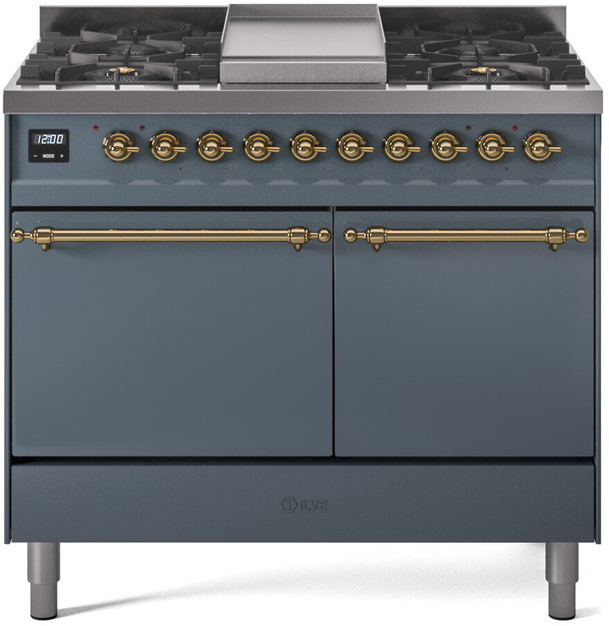 Freestanding Dual Fuel Range with 6 Sealed Burners, 4.3 cu. ft. Total Capacity, Storage Drawer, and Griddle: Blue Grey, Brass Trim, Solid Door. Enjoy a range of cooking options with six sealed burners, offering precise heat control for any recipe. With 4.3 cubic feet of oven space, you can easily prepare meals of all sizes, from weeknight dinners to holiday feasts. Keep your kitchen essentials organized and close at hand with the convenient storage drawer. Expand your cooking repertoire with the built-in griddle, perfect for making breakfast favorites and grilled sandwiches. With power up to 25000 btu as standard. Optimal supply and perfect distribution of the heat, for all types of cooking. With non-stick nanotechnological treatment. The noble technical characteristics of brass are enriched with a nanotechnological coating that assures easy cleaning, with an elegant Total Black finish. Structure in AISI 304 steel with 12/10 thickness, option to choose the ideal combination between a gas hob with up to 9 burners or induction, mixed and in various setups. The indestructible cast iron pan supports provide a functional and safe support for the pots. The electronic control ensures that the temperature of the oven remains constant throughout, without fluctuating, as is the case in conventional ovens. It can be set with precision starting from 85F, for perfect proofing, up to 575F, for roasting. The door hinges are fitted with a shock absorber that makes the closure more gradual and noiseless. The quick oven preheating function allows it to reach the desired temperature in a short time and you can then choose the best-suited cooking mode for the dish. It also works as rapid defrosting when a low temperature is set (85F 105F). The grease does not stick to the surface and can therefore be cleaned more easily. Pizza function. Quick start. Multiple fan cooking. Intensive cooking. Fan grill cooking. Grill cooking with closed-door. Cooking from above. Cooking from below. Static normal cooking. Grill cooking with closed-door. Cooking from above. Cooking from below. Static normal cooking. Series: Nostalgie II. Noblesse Frames: No. Fuel Type: Dual Fuel. Installation Type: Freestanding. Oven Total Capacity (cu. ft.): 4.3. Sabbath Mode: No. Number of Racks: 2. Drawer Type: Storage Drawer. Display Type: LCD Display. Timer: Yes. Cooking Probe: Yes. Rotisserie: Yes. Soft Close Door: Yes. Cooktop Configuration: 6 Sealed Burners + Griddle. Burner/Element Type: Sealed Burner. Number of Burners/Elements: 6. Griddle: Yes. Grill: No. French Top: No. Burner/Element Output 1: 25000 BTU/h 900 BTU/h. Burner/Element Output 2: 7000 BTU/h 1400 BTU/h. Burner/Element Output 3: 25000 BTU/h 900 BTU/h. Burner/Element Output 4: 10500 BTU/h 2000 BTU/h. Burner/Element Output 5: 10500 BTU/h 2000 BTU/h. Burner/Element Output 6: 10500 BTU/h 2000 BTU/h. Oven Control Type: Knobs. Oven Door Type: Solid Door. Number of Ovens: Double Oven. Main Oven Capacity (cu. ft.): 2.3. Second Oven Capacity (cu. ft.): 2. Oven Cleaning Type: Easy Clean Enamel Cavities. Main Oven Type: UOV 60 M. Second Oven Type: UOV 40 E. ADA Compliant: No. Star-K Certified: No. Voltage: 240 V. Amps: 26 A. Exterior Width: 40". Width: 39 3/8". Depth: 27". Height: 36 1/4" - 38 1/2".