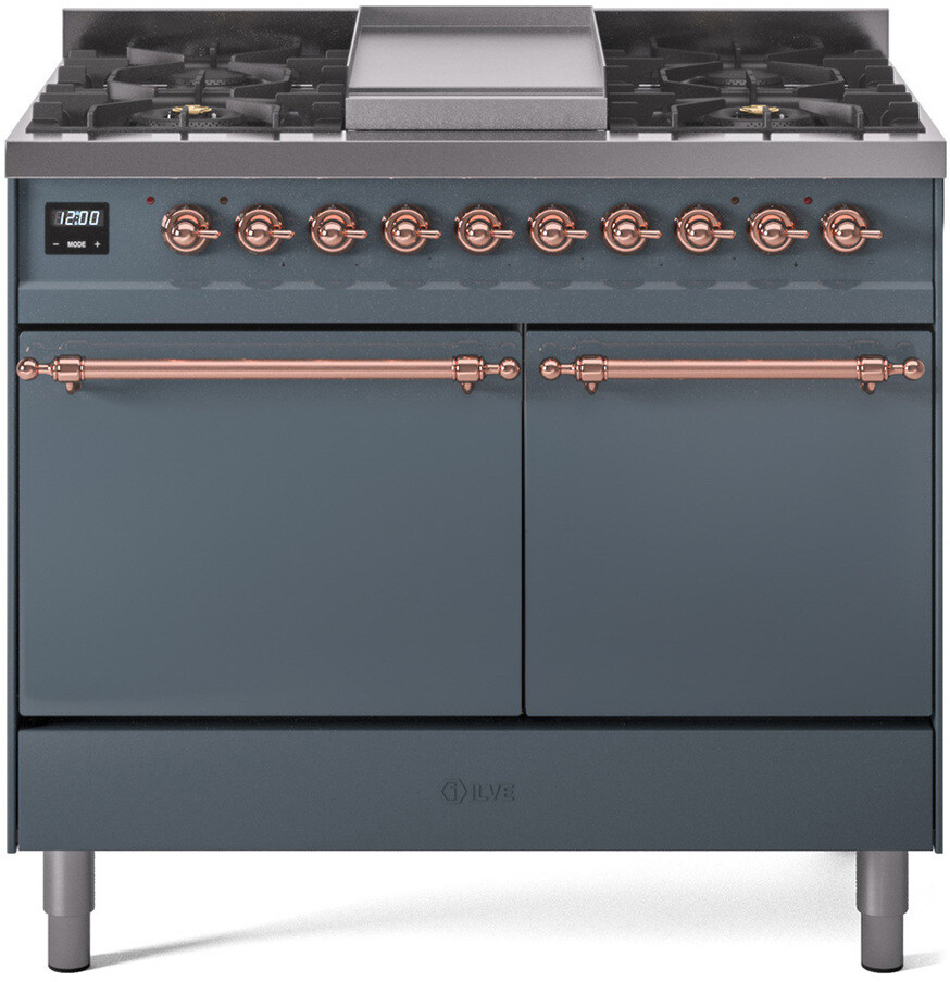 Freestanding Dual Fuel Range with 6 Sealed Burners, 4.3 cu. ft. Total Capacity, Storage Drawer, and Griddle: Blue Grey, Copper Trim, Solid Door. Enjoy a range of cooking options with six sealed burners, offering precise heat control for any recipe. With 4.3 cubic feet of oven space, you can easily prepare meals of all sizes, from weeknight dinners to holiday feasts. Keep your kitchen essentials organized and close at hand with the convenient storage drawer. Expand your cooking repertoire with the built-in griddle, perfect for making breakfast favorites and grilled sandwiches. With power up to 25000 btu as standard. Optimal supply and perfect distribution of the heat, for all types of cooking. With non-stick nanotechnological treatment. The noble technical characteristics of brass are enriched with a nanotechnological coating that assures easy cleaning, with an elegant Total Black finish. Structure in AISI 304 steel with 12/10 thickness, option to choose the ideal combination between a gas hob with up to 9 burners or induction, mixed and in various setups. The indestructible cast iron pan supports provide a functional and safe support for the pots. The electronic control ensures that the temperature of the oven remains constant throughout, without fluctuating, as is the case in conventional ovens. It can be set with precision starting from 85F, for perfect proofing, up to 575F, for roasting. The door hinges are fitted with a shock absorber that makes the closure more gradual and noiseless. The quick oven preheating function allows it to reach the desired temperature in a short time and you can then choose the best-suited cooking mode for the dish. It also works as rapid defrosting when a low temperature is set (85F 105F). The grease does not stick to the surface and can therefore be cleaned more easily. Pizza function. Quick start. Multiple fan cooking. Intensive cooking. Fan grill cooking. Grill cooking with closed-door. Cooking from above. Cooking from below. Static normal cooking. Grill cooking with closed-door. Cooking from above. Cooking from below. Static normal cooking. Series: Nostalgie II. Noblesse Frames: No. Fuel Type: Dual Fuel. Installation Type: Freestanding. Oven Total Capacity (cu. ft.): 4.3. Sabbath Mode: No. Number of Racks: 2. Drawer Type: Storage Drawer. Display Type: LCD Display. Timer: Yes. Cooking Probe: Yes. Rotisserie: Yes. Soft Close Door: Yes. Cooktop Configuration: 6 Sealed Burners + Griddle. Burner/Element Type: Sealed Burner. Number of Burners/Elements: 6. Griddle: Yes. Grill: No. French Top: No. Burner/Element Output 1: 25000 BTU/h 900 BTU/h. Burner/Element Output 2: 7000 BTU/h 1400 BTU/h. Burner/Element Output 3: 25000 BTU/h 900 BTU/h. Burner/Element Output 4: 10500 BTU/h 2000 BTU/h. Burner/Element Output 5: 10500 BTU/h 2000 BTU/h. Burner/Element Output 6: 10500 BTU/h 2000 BTU/h. Oven Control Type: Knobs. Oven Door Type: Solid Door. Number of Ovens: Double Oven. Main Oven Capacity (cu. ft.): 2.3. Second Oven Capacity (cu. ft.): 2. Oven Cleaning Type: Easy Clean Enamel Cavities. Main Oven Type: UOV 60 M. Second Oven Type: UOV 40 E. ADA Compliant: No. Star-K Certified: No. Voltage: 240 V. Amps: 26 A. Exterior Width: 40". Width: 39 3/8". Depth: 27". Height: 36 1/4" - 38 1/2".