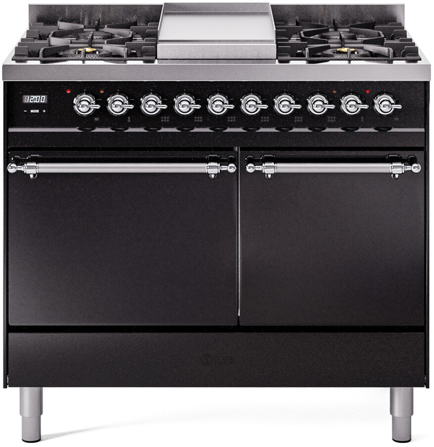 Freestanding Dual Fuel Range with 6 Sealed Burners, 4.3 cu. ft. Total Capacity, Storage Drawer, and Griddle: Glossy Black, Chrome Trim, Solid Door. Enjoy a range of cooking options with six sealed burners, offering precise heat control for any recipe. With 4.3 cubic feet of oven space, you can easily prepare meals of all sizes, from weeknight dinners to holiday feasts. Keep your kitchen essentials organized and close at hand with the convenient storage drawer. Expand your cooking repertoire with the built-in griddle, perfect for making breakfast favorites and grilled sandwiches. With power up to 25000 btu as standard. Optimal supply and perfect distribution of the heat, for all types of cooking. With non-stick nanotechnological treatment. The noble technical characteristics of brass are enriched with a nanotechnological coating that assures easy cleaning, with an elegant Total Black finish. Structure in AISI 304 steel with 12/10 thickness, option to choose the ideal combination between a gas hob with up to 9 burners or induction, mixed and in various setups. The indestructible cast iron pan supports provide a functional and safe support for the pots. The electronic control ensures that the temperature of the oven remains constant throughout, without fluctuating, as is the case in conventional ovens. It can be set with precision starting from 85F, for perfect proofing, up to 575F, for roasting. The door hinges are fitted with a shock absorber that makes the closure more gradual and noiseless. The quick oven preheating function allows it to reach the desired temperature in a short time and you can then choose the best-suited cooking mode for the dish. It also works as rapid defrosting when a low temperature is set (85F 105F). The grease does not stick to the surface and can therefore be cleaned more easily. Pizza function. Quick start. Multiple fan cooking. Intensive cooking. Fan grill cooking. Grill cooking with closed-door. Cooking from above. Cooking from below. Static normal cooking. Grill cooking with closed-door. Cooking from above. Cooking from below. Static normal cooking. Series: Nostalgie II. Noblesse Frames: No. Fuel Type: Dual Fuel. Installation Type: Freestanding. Oven Total Capacity (cu. ft.): 4.3. Sabbath Mode: No. Number of Racks: 2. Drawer Type: Storage Drawer. Display Type: LCD Display. Timer: Yes. Cooking Probe: Yes. Rotisserie: Yes. Soft Close Door: Yes. Cooktop Configuration: 6 Sealed Burners + Griddle. Burner/Element Type: Sealed Burner. Number of Burners/Elements: 6. Griddle: Yes. Grill: No. French Top: No. Burner/Element Output 1: 25000 BTU/h 900 BTU/h. Burner/Element Output 2: 7000 BTU/h 1400 BTU/h. Burner/Element Output 3: 25000 BTU/h 900 BTU/h. Burner/Element Output 4: 10500 BTU/h 2000 BTU/h. Burner/Element Output 5: 10500 BTU/h 2000 BTU/h. Burner/Element Output 6: 10500 BTU/h 2000 BTU/h. Oven Control Type: Knobs. Oven Door Type: Solid Door. Number of Ovens: Double Oven. Main Oven Capacity (cu. ft.): 2.3. Second Oven Capacity (cu. ft.): 2. Oven Cleaning Type: Easy Clean Enamel Cavities. Main Oven Type: UOV 60 M. Second Oven Type: UOV 40 E. ADA Compliant: No. Star-K Certified: No. Voltage: 240 V. Amps: 26 A. Exterior Width: 40". Width: 39 3/8". Depth: 27". Height: 36 1/4" - 38 1/2".