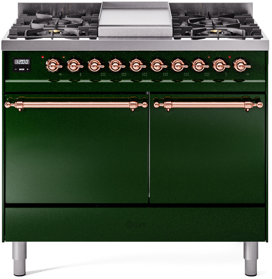 Freestanding Dual Fuel Range with 6 Sealed Burners, 4.3 cu. ft. Total Capacity, Storage Drawer, and Griddle: Emerald Green, Copper Trim, Solid Door. Enjoy a range of cooking options with six sealed burners, offering precise heat control for any recipe. With 4.3 cubic feet of oven space, you can easily prepare meals of all sizes, from weeknight dinners to holiday feasts. Keep your kitchen essentials organized and close at hand with the convenient storage drawer. Expand your cooking repertoire with the built-in griddle, perfect for making breakfast favorites and grilled sandwiches. With power up to 25000 btu as standard. Optimal supply and perfect distribution of the heat, for all types of cooking. With non-stick nanotechnological treatment. The noble technical characteristics of brass are enriched with a nanotechnological coating that assures easy cleaning, with an elegant Total Black finish. Structure in AISI 304 steel with 12/10 thickness, option to choose the ideal combination between a gas hob with up to 9 burners or induction, mixed and in various setups. The indestructible cast iron pan supports provide a functional and safe support for the pots. The electronic control ensures that the temperature of the oven remains constant throughout, without fluctuating, as is the case in conventional ovens. It can be set with precision starting from 85F, for perfect proofing, up to 575F, for roasting. The door hinges are fitted with a shock absorber that makes the closure more gradual and noiseless. The quick oven preheating function allows it to reach the desired temperature in a short time and you can then choose the best-suited cooking mode for the dish. It also works as rapid defrosting when a low temperature is set (85F 105F). The grease does not stick to the surface and can therefore be cleaned more easily. Pizza function. Quick start. Multiple fan cooking. Intensive cooking. Fan grill cooking. Grill cooking with closed-door. Cooking from above. Cooking from below. Static normal cooking. Grill cooking with closed-door. Cooking from above. Cooking from below. Static normal cooking. Series: Nostalgie II. Noblesse Frames: No. Fuel Type: Dual Fuel. Installation Type: Freestanding. Oven Total Capacity (cu. ft.): 4.3. Sabbath Mode: No. Number of Racks: 2. Drawer Type: Storage Drawer. Display Type: LCD Display. Timer: Yes. Cooking Probe: Yes. Rotisserie: Yes. Soft Close Door: Yes. Cooktop Configuration: 6 Sealed Burners + Griddle. Burner/Element Type: Sealed Burner. Number of Burners/Elements: 6. Griddle: Yes. Grill: No. French Top: No. Burner/Element Output 1: 25000 BTU/h 900 BTU/h. Burner/Element Output 2: 7000 BTU/h 1400 BTU/h. Burner/Element Output 3: 25000 BTU/h 900 BTU/h. Burner/Element Output 4: 10500 BTU/h 2000 BTU/h. Burner/Element Output 5: 10500 BTU/h 2000 BTU/h. Burner/Element Output 6: 10500 BTU/h 2000 BTU/h. Oven Control Type: Knobs. Oven Door Type: Solid Door. Number of Ovens: Double Oven. Main Oven Capacity (cu. ft.): 2.3. Second Oven Capacity (cu. ft.): 2. Oven Cleaning Type: Easy Clean Enamel Cavities. Main Oven Type: UOV 60 M. Second Oven Type: UOV 40 E. ADA Compliant: No. Star-K Certified: No. Voltage: 240 V. Amps: 26 A. Exterior Width: 40". Width: 39 3/8". Depth: 27". Height: 36 1/4" - 38 1/2".