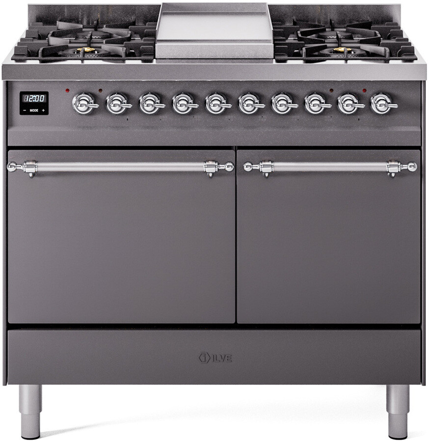 Freestanding Dual Fuel Range with 6 Sealed Burners, 4.3 cu. ft. Total Capacity, Storage Drawer, and Griddle: Graphite Matte, Chrome Trim, Solid Door. Enjoy a range of cooking options with six sealed burners, offering precise heat control for any recipe. With 4.3 cubic feet of oven space, you can easily prepare meals of all sizes, from weeknight dinners to holiday feasts. Keep your kitchen essentials organized and close at hand with the convenient storage drawer. Expand your cooking repertoire with the built-in griddle, perfect for making breakfast favorites and grilled sandwiches. With power up to 25000 btu as standard. Optimal supply and perfect distribution of the heat, for all types of cooking. With non-stick nanotechnological treatment. The noble technical characteristics of brass are enriched with a nanotechnological coating that assures easy cleaning, with an elegant Total Black finish. Structure in AISI 304 steel with 12/10 thickness, option to choose the ideal combination between a gas hob with up to 9 burners or induction, mixed and in various setups. The indestructible cast iron pan supports provide a functional and safe support for the pots. The electronic control ensures that the temperature of the oven remains constant throughout, without fluctuating, as is the case in conventional ovens. It can be set with precision starting from 85F, for perfect proofing, up to 575F, for roasting. The door hinges are fitted with a shock absorber that makes the closure more gradual and noiseless. The quick oven preheating function allows it to reach the desired temperature in a short time and you can then choose the best-suited cooking mode for the dish. It also works as rapid defrosting when a low temperature is set (85F 105F). The grease does not stick to the surface and can therefore be cleaned more easily. Pizza function. Quick start. Multiple fan cooking. Intensive cooking. Fan grill cooking. Grill cooking with closed-door. Cooking from above. Cooking from below. Static normal cooking. Grill cooking with closed-door. Cooking from above. Cooking from below. Static normal cooking. Series: Nostalgie II. Noblesse Frames: No. Fuel Type: Dual Fuel. Installation Type: Freestanding. Oven Total Capacity (cu. ft.): 4.3. Sabbath Mode: No. Number of Racks: 2. Drawer Type: Storage Drawer. Display Type: LCD Display. Timer: Yes. Cooking Probe: Yes. Rotisserie: Yes. Soft Close Door: Yes. Cooktop Configuration: 6 Sealed Burners + Griddle. Burner/Element Type: Sealed Burner. Number of Burners/Elements: 6. Griddle: Yes. Grill: No. French Top: No. Burner/Element Output 1: 25000 BTU/h 900 BTU/h. Burner/Element Output 2: 7000 BTU/h 1400 BTU/h. Burner/Element Output 3: 25000 BTU/h 900 BTU/h. Burner/Element Output 4: 10500 BTU/h 2000 BTU/h. Burner/Element Output 5: 10500 BTU/h 2000 BTU/h. Burner/Element Output 6: 10500 BTU/h 2000 BTU/h. Oven Control Type: Knobs. Oven Door Type: Solid Door. Number of Ovens: Double Oven. Main Oven Capacity (cu. ft.): 2.3. Second Oven Capacity (cu. ft.): 2. Oven Cleaning Type: Easy Clean Enamel Cavities. Main Oven Type: UOV 60 M. Second Oven Type: UOV 40 E. ADA Compliant: No. Star-K Certified: No. Voltage: 240 V. Amps: 26 A. Exterior Width: 40". Width: 39 3/8". Depth: 27". Height: 36 1/4" - 38 1/2".
